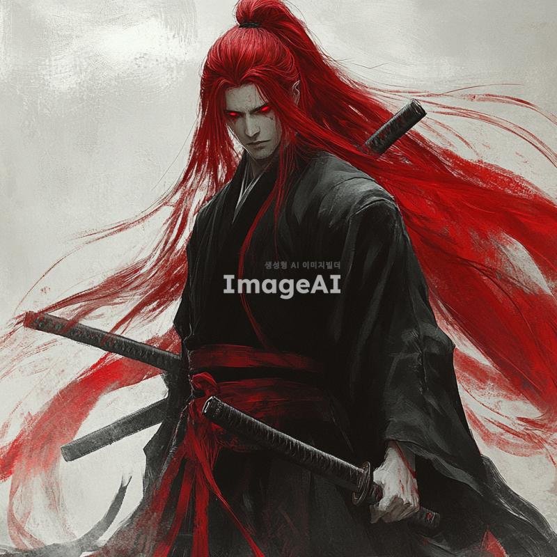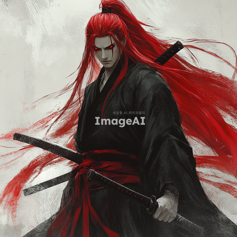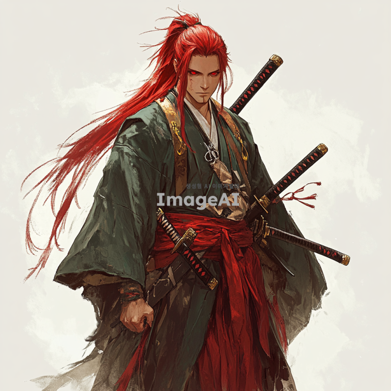 길고 붉은 머리카락을 묶어놓은 남자이며 붉은 눈동자가 있다 옷은 일본식처럼 보이는 도사의 옷을 입고 있고 등뒤에 검 하나와 허리에 두개의 검을 차고있다