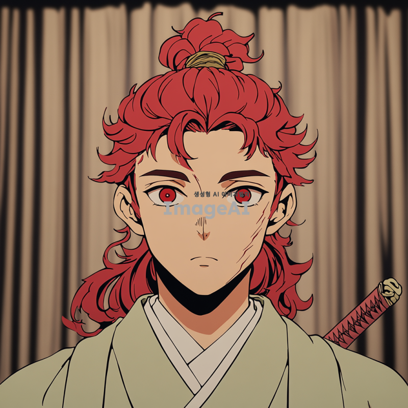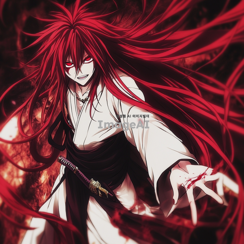 길고 묶여져 있는 붉은 머리카락에 왼쪽는에는 세로로 상처가 있으며 빨간색 눈동자이다 일본식느낌에 도사복이며 검이 등뒤에 한자루 허리에 두자루가 있다 남자이다