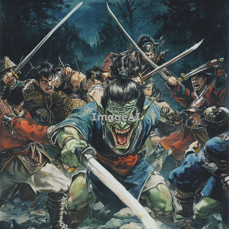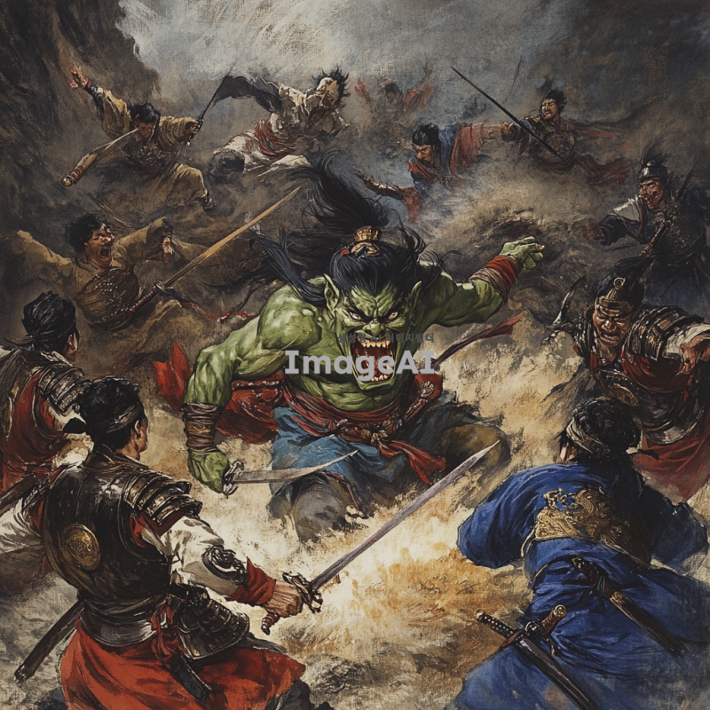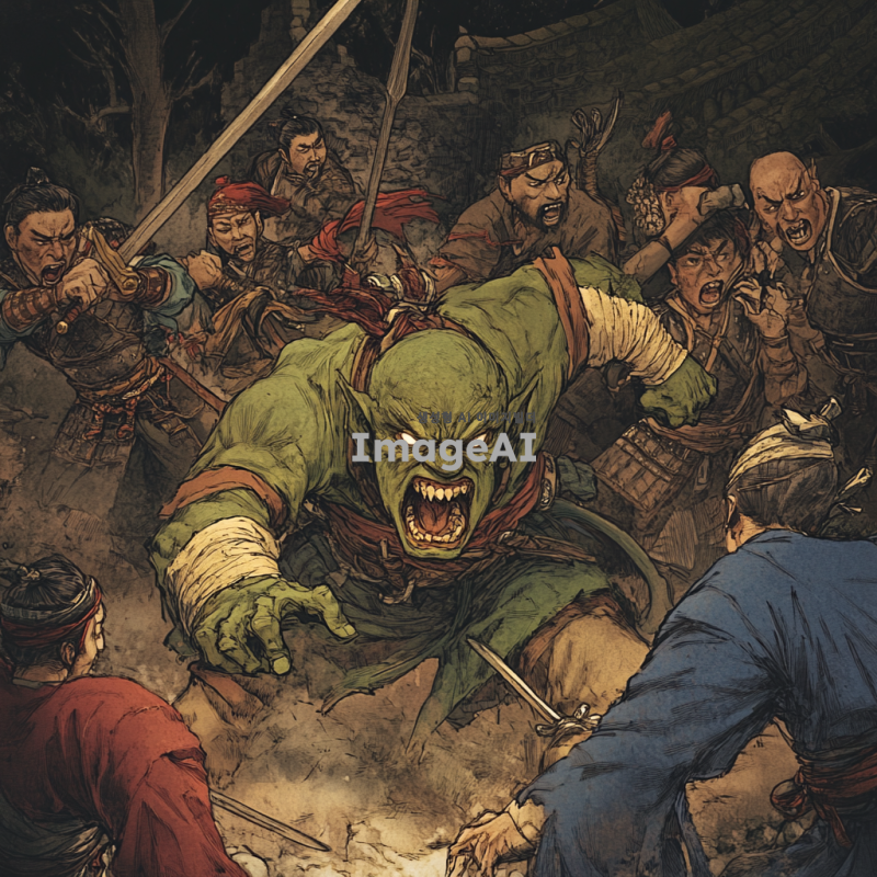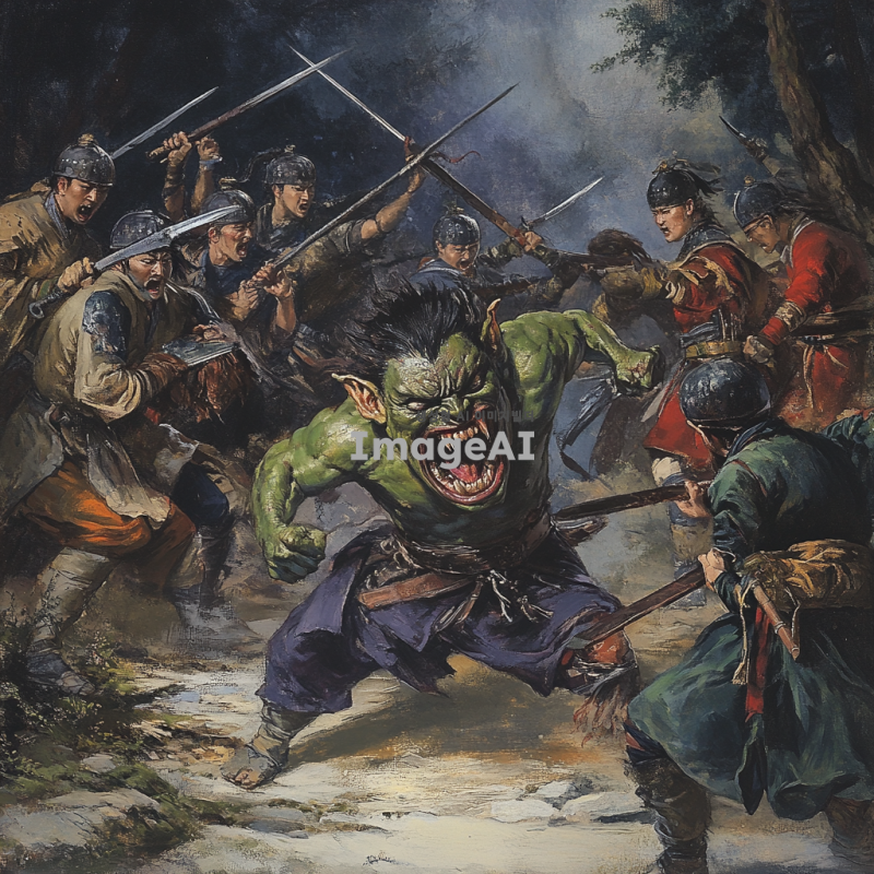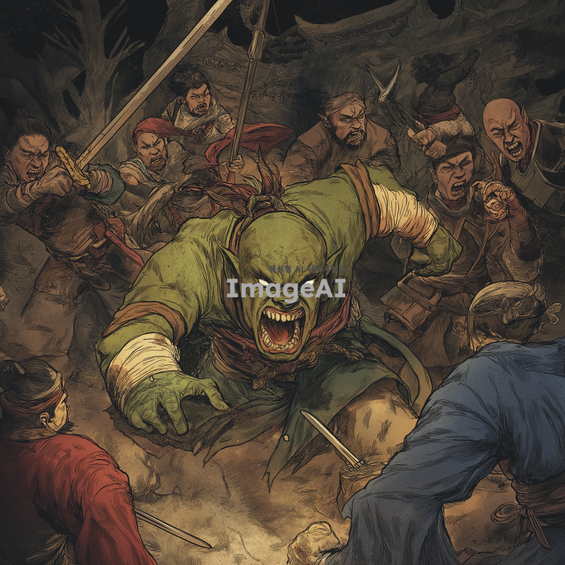 고블린이 여러 사람과 전투를 벌이는 장면, 고블린은 녹색 피부와 날카로운 이빨을 가지고 있으며, 작은 키에 날렵한 움직임을 보인다. 주변에는 다양한 한국인 전사들이 각기 다른 무기를 들고 고블린과 맞서 싸우고 있다. 배경은 어두운 숲속으로, 긴장감이 감도는 분위기다. 전사들은 전통적인 한국 갑옷을 입고 있으며, 고블린의 공격을 피하고 반격하는 역동적인 자세를 취하고 있다. 전투의 긴박함과 고블린의 사나운 표정을 강조하여 묘사.