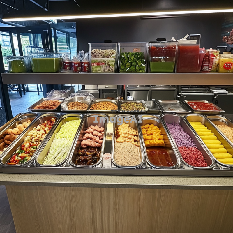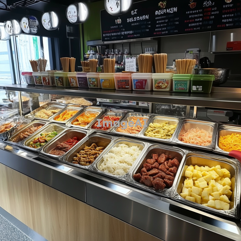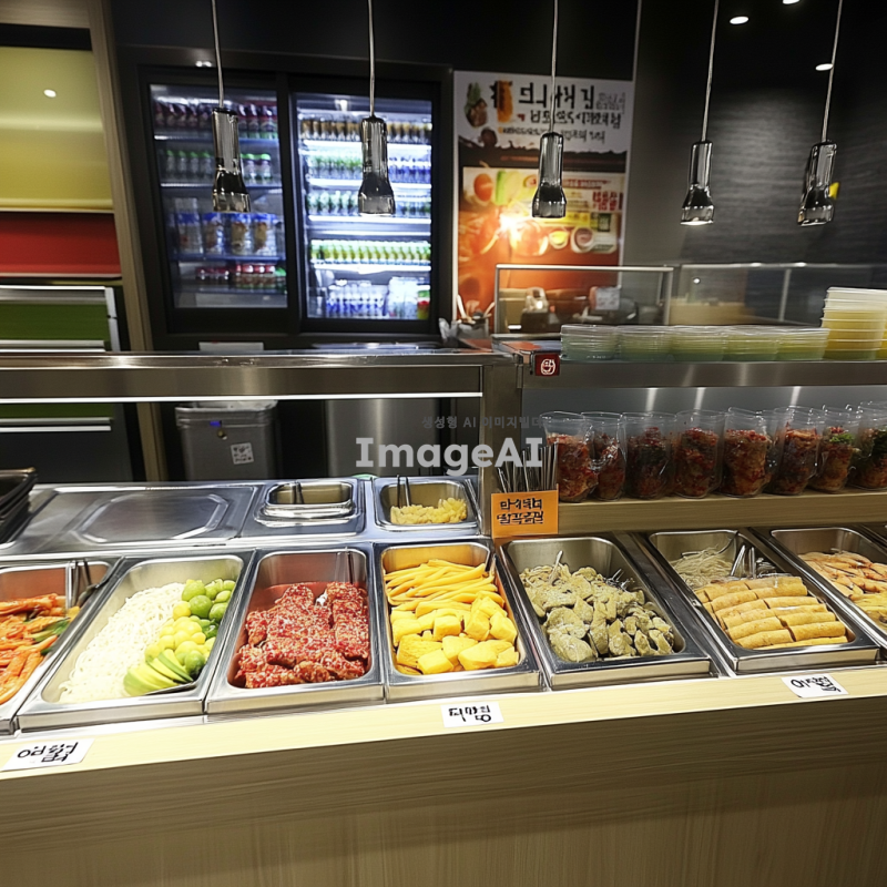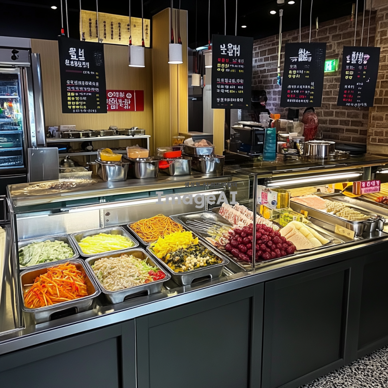 밝고 현대적인 한국의 셀프바 내부, 다양한 음식과 음료가 깔끔하게 진열되어 있는 모습, 각기 다른 종류의 셀프바가 나란히 배치되어 있으며, 신선한 재료와 다채로운 색상의 음식들이 돋보이는 장면, 따뜻하고 환영하는 분위기의 조명, 고객들이 자유롭게 음식을 선택하는 모습, 깨끗하고 정돈된 환경, 한국 전통 음식과 현대적인 메뉴가 조화를 이루는 장면, 전체적으로 깔끔하고 정돈된 인테리어 디자인.