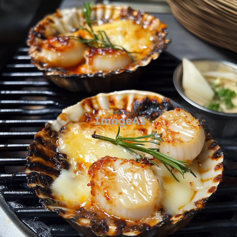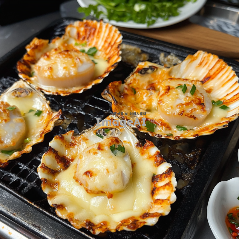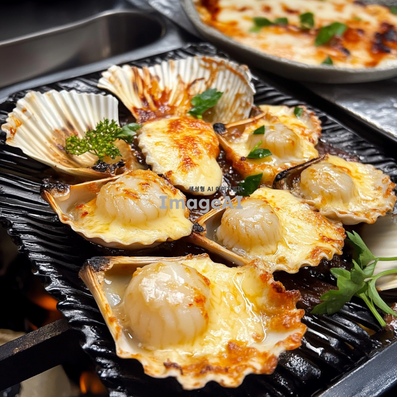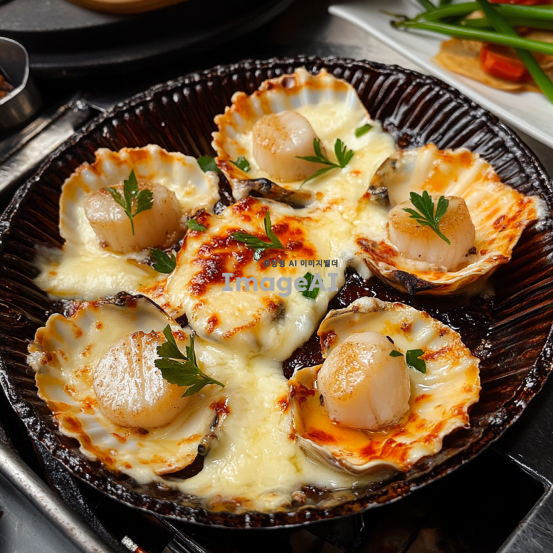 한국의 해산물 요리, 가리비 위에 녹아내리는 치즈가 먹음직스럽게 늘어나는 모습, 노릇노릇하게 구워진 가리비 껍질, 치즈의 크리미한 질감과 황금빛 색상, 주변에는 신선한 허브 장식, 따뜻하고 아늑한 분위기의 식탁, 고급스러운 요리 프레젠테이션.