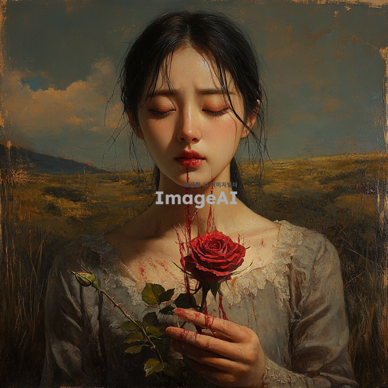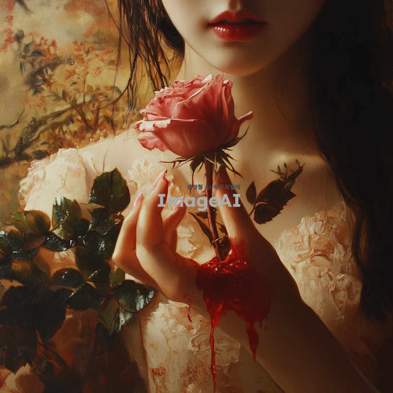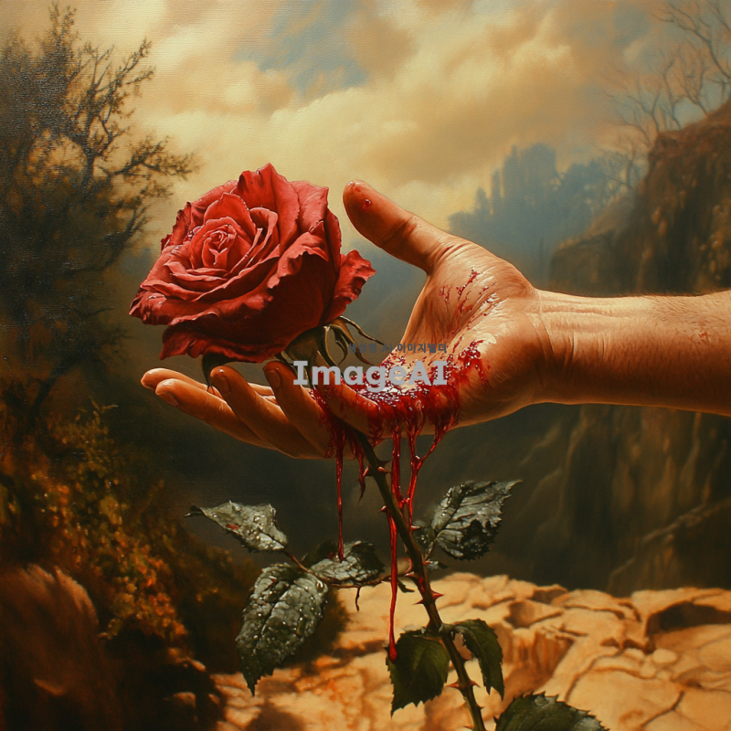 한국인 성인이 장미를 움켜쥐고 있는 모습, 장미에는 날카로운 가시가 돋아나 있으며, 손에는 가시에 찔려 붉은 물이흐르는 섬세한 표현, 배경은 부드러운 자연의 풍경, 감정은 결단력과 강인함이 느껴지는 표정, 따뜻한 조명으로 장미와 손의 디테일을 강조