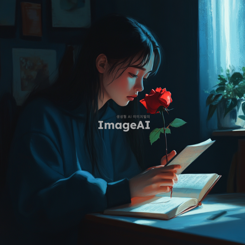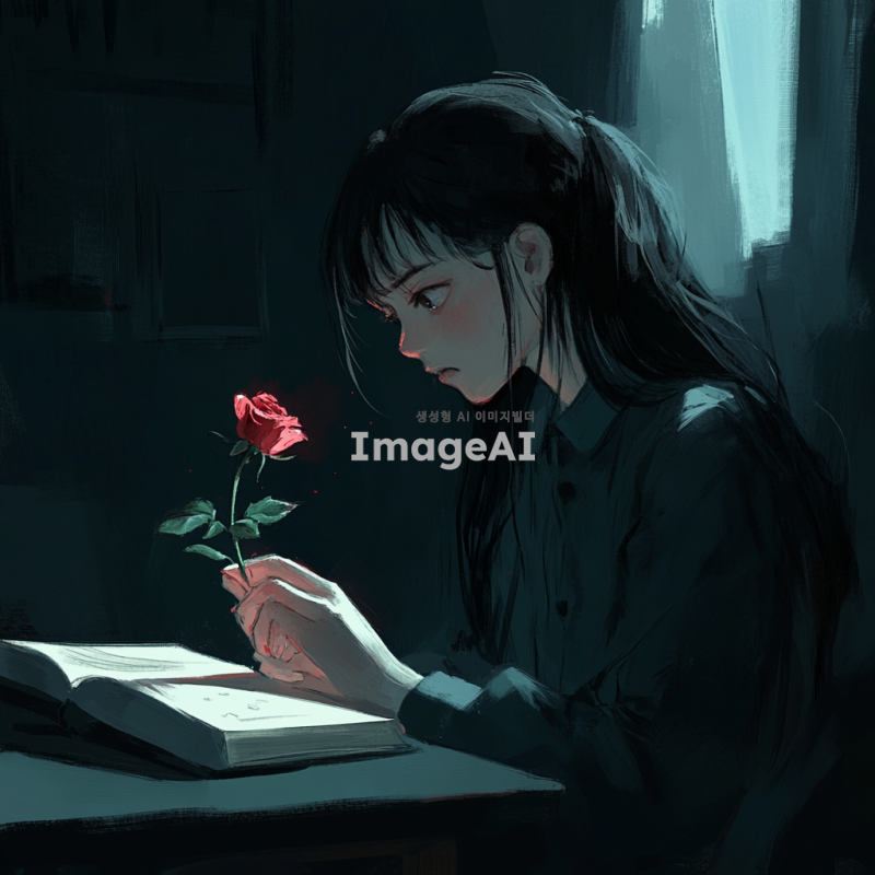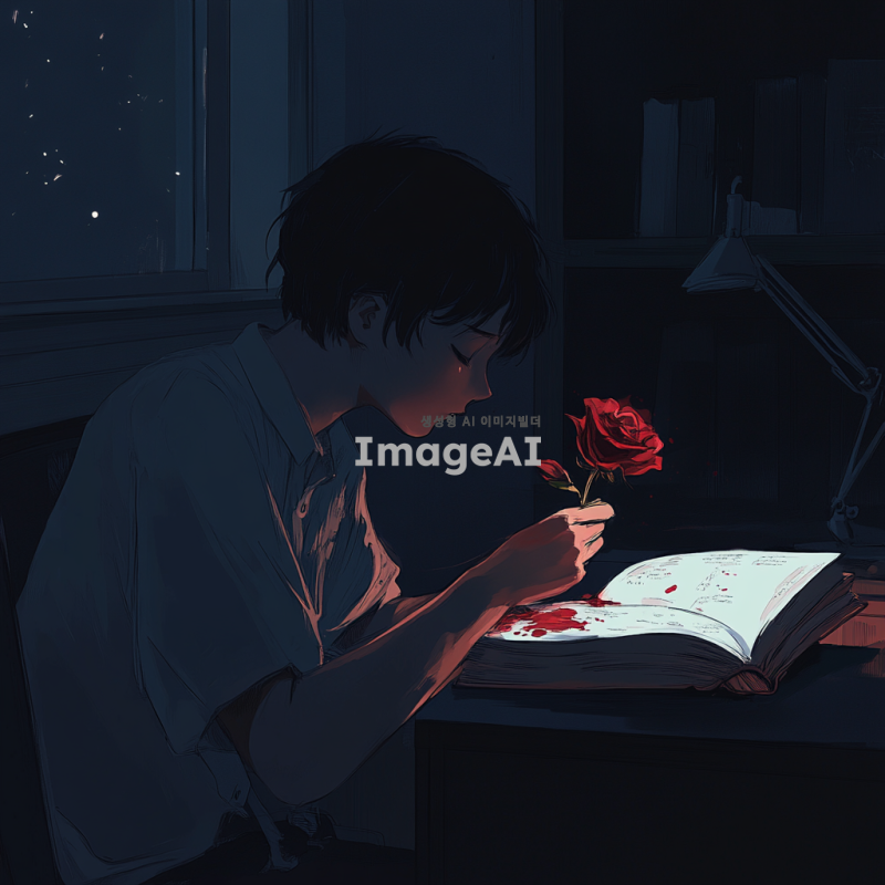 어두운 방 안에서 책상에 앉아 있는 학생이 졸린 눈으로 책을 바라보고 있다. 학생의 손은 가시가 돋아있는 붉은 장미를 잡고 있으며, 손가락 끝에서 약간의 붉은 물이 맺혀있다. 장미의 가시는 빛을 받아 반짝이고 있으며, 학생의 표정은 아픔과 함께 깨어나는 듯한 느낌을 준다. 방 안은 조용하고 집중된 분위기를 자아내며, 창문으로 들어오는 희미한 달빛이 장면을 부드럽게 비춘다.