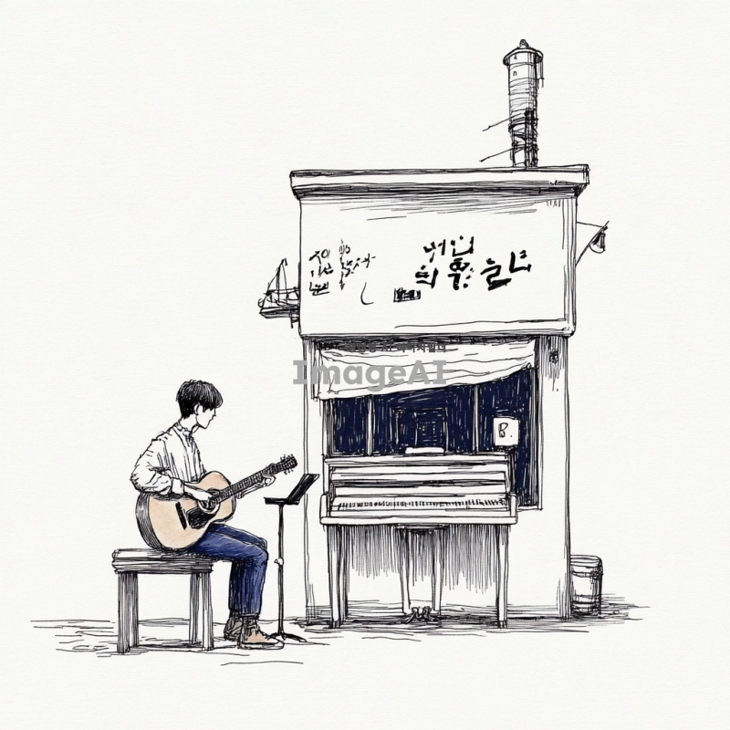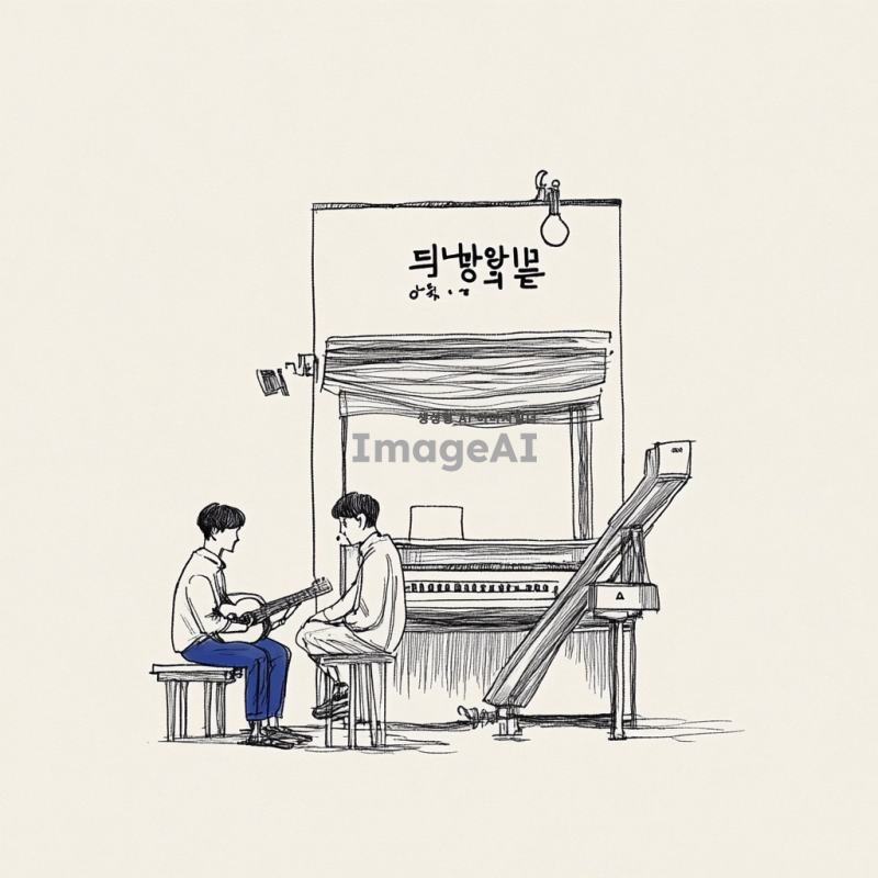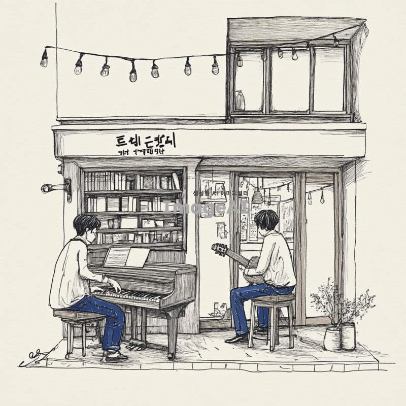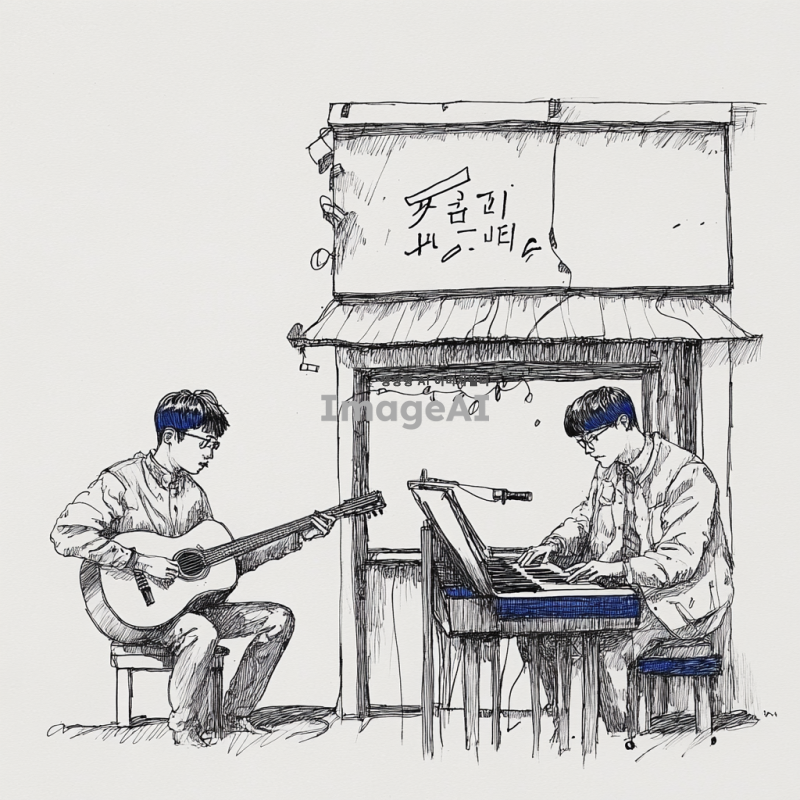 모노라인 스타일의 펜 일러스트로 기타와 피아노를 연주하는 두 명의 한국 남자, 쓸쓸한 분위기, 배경 없음, 세부적인 선으로 감정을 표현한 그림.