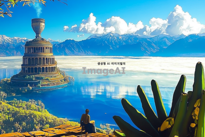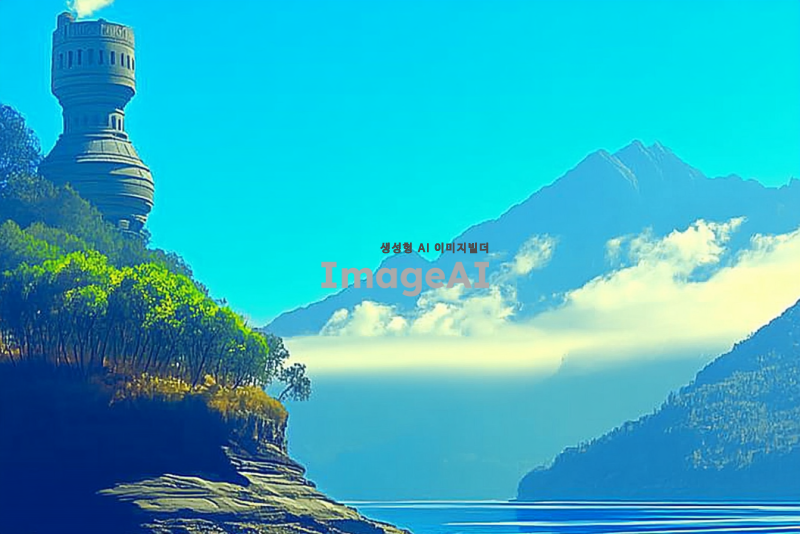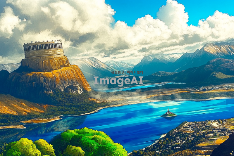 푸르고 광활한 하늘 아래, 중앙에는 뾰족하고 깍듯한 산맥이 구름을 뚫고 솟아오르는 장면. 아래에는 커다랗고 맑은 푸른 호수가 펼쳐져 있으며, 호수 위 하늘로 솟아오른 섬에는 콜로세움을 닮은 건축물이 우뚝 서 있는 모습. 자연과 건축물이 조화롭게 어우러진 풍경.