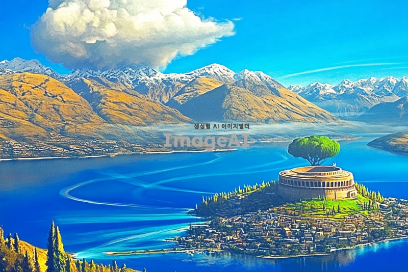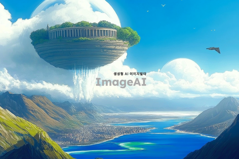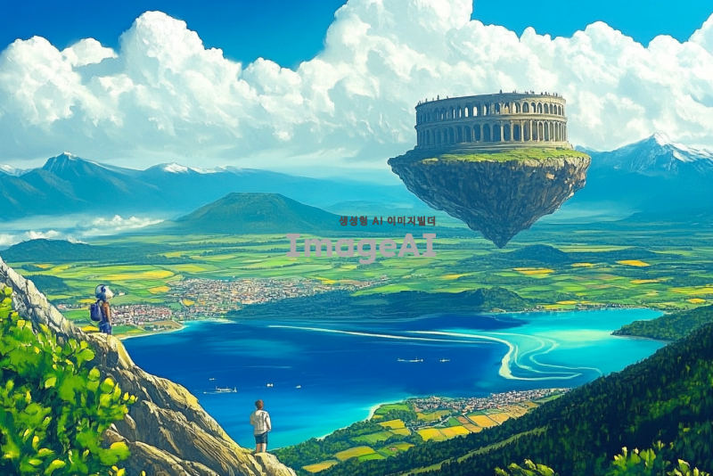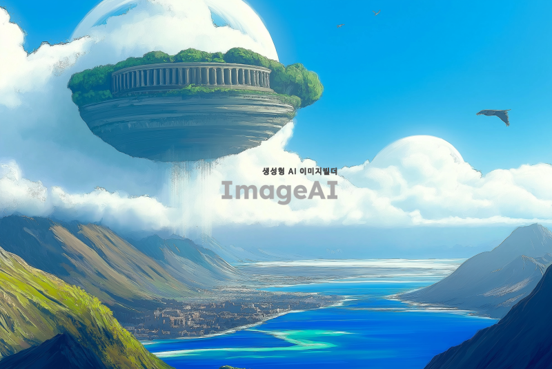 광활하고 푸르고 높은 하늘, 하늘을 찌르듯 높은 산맥. 깊이를 알 수 없을 정도로 푸르고 맑은 넓은 호수와 그 위로 솟아올라 호숫가 물이 흐르고 있는 콜로세움이 있는 하늘섬