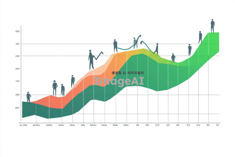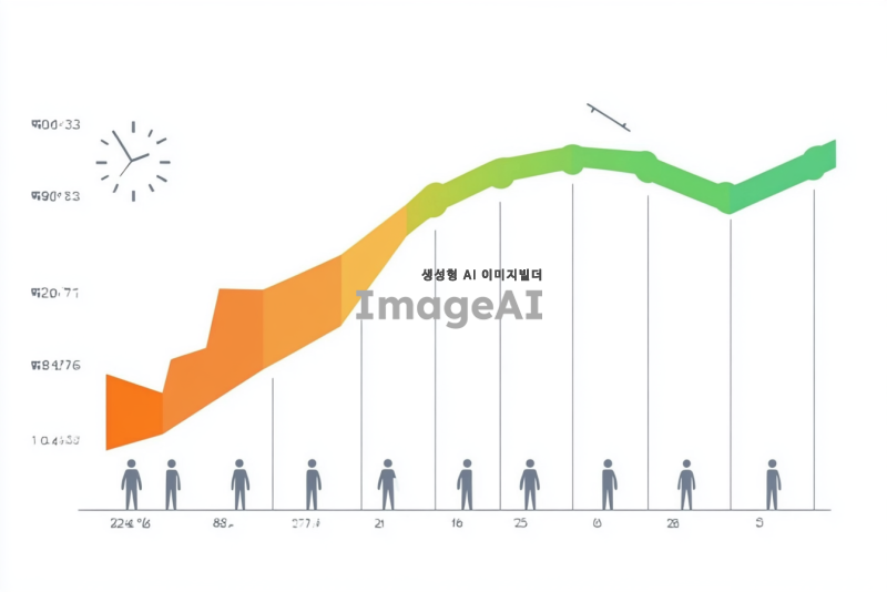 기간제 근로자, 파견 근로자, 시간제 근로자의 생산성 저조를 나타내는 그래프. 그래프는 하향 곡선을 그리며, 각각의 근로자 유형에 대해 다른 색상으로 구분되어 있음. 그래프의 배경은 심플한 디자인으로, 직관적으로 생산성이 떨어지고 있음을 시각적으로 강조. 그래프의 축에는 생산성 지표와 시간의 흐름을 나타내는 레이블이 명확하게 표시되어 있음.