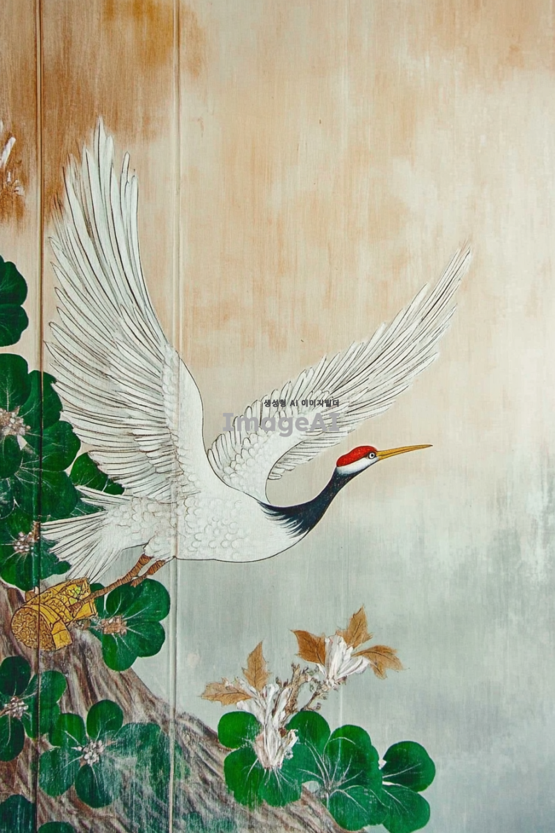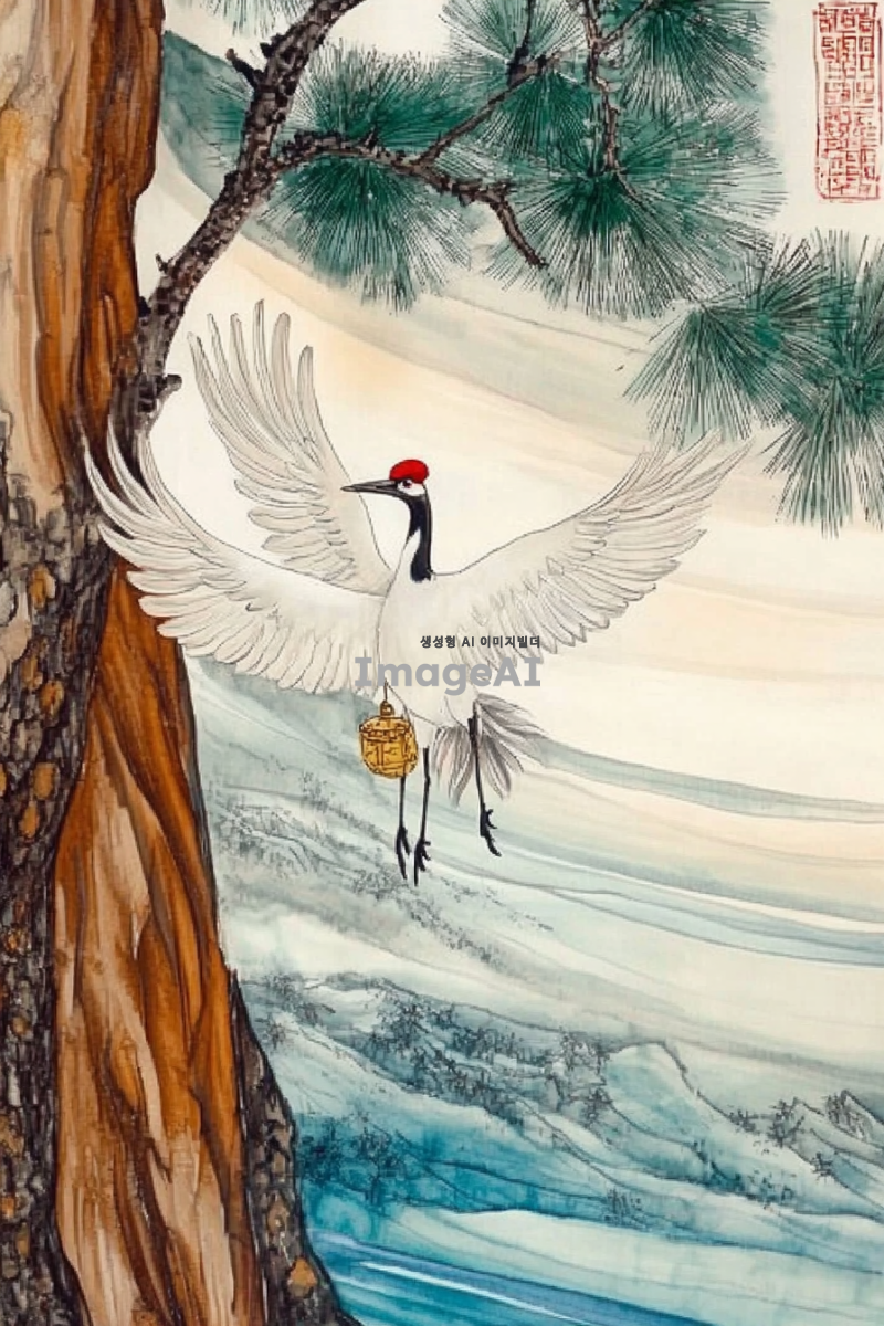 전통적인 한국 민화 스타일로 그려진 학, 학이 복주머니를 들고 하늘로 날아오르는 웅장하고 따뜻한 느낌