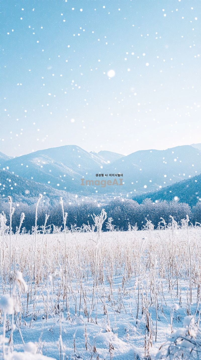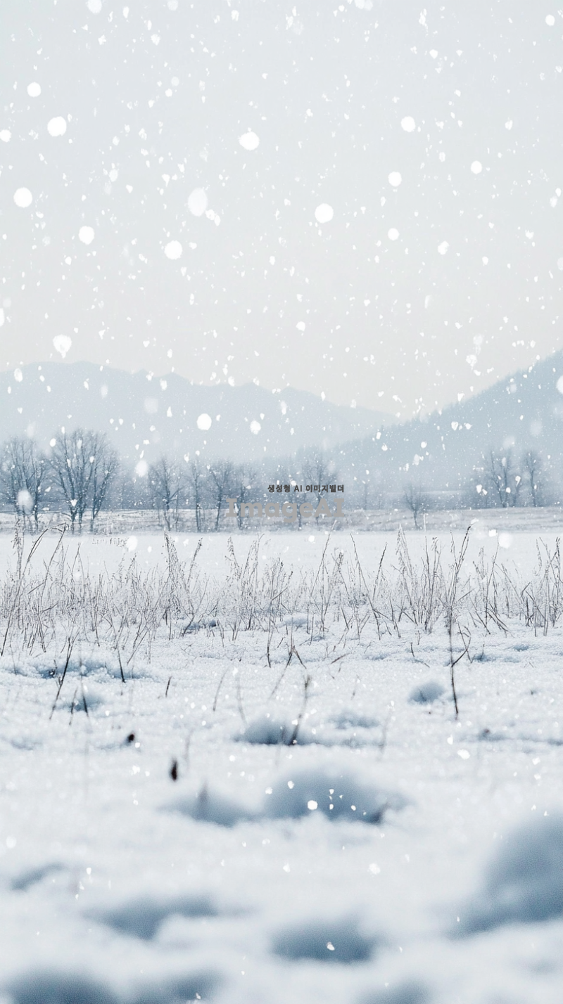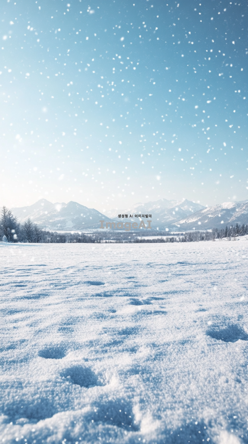 눈 덮인 광활한 겨울 들판, 멀리 보이는 산맥, 맑은 하늘과 함께 부드럽게 떨어지는 눈송이, 고요하고 평화로운 분위기, 차가운 공기가 느껴지는 장면, 자연의 아름다움과 겨울의 고요함이 조화를 이루는 풍경.