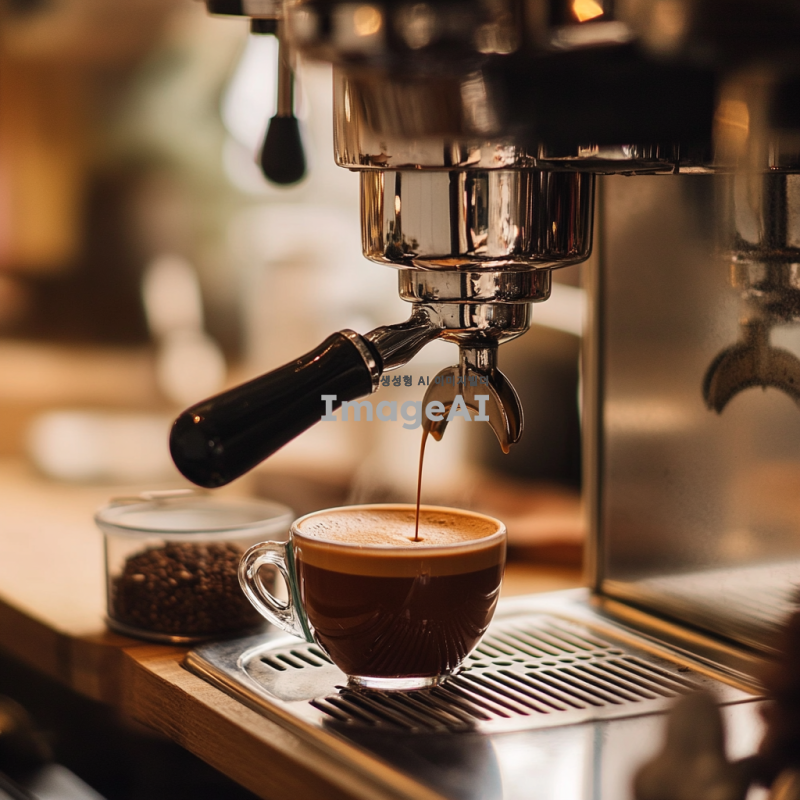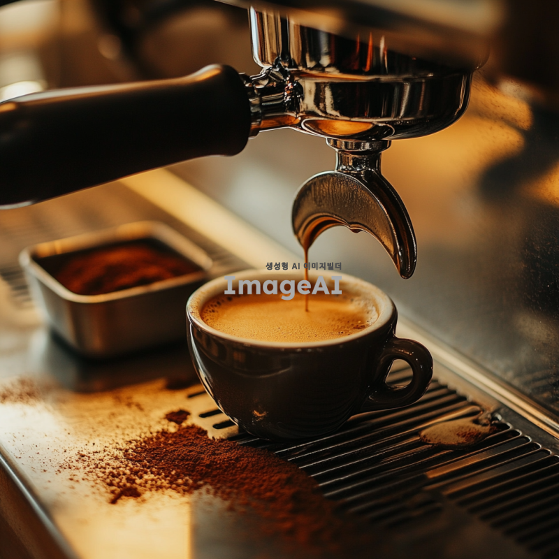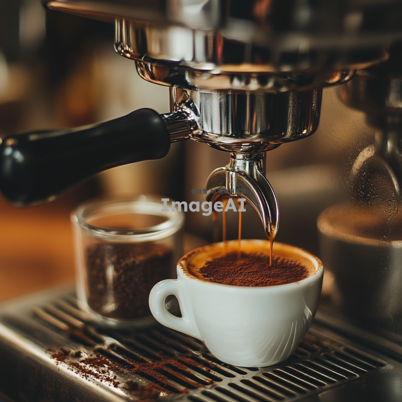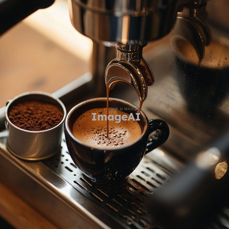 에스프레소 머신에서 커피를 추출하는 장면, 진한 갈색의 에스프레소가 작은 컵에 채워지는 모습, 옆에는 커피박이 담긴 작은 통이 놓여 있는 장면, 따뜻하고 아늑한 카페 분위기, 자연광이 부드럽게 비치는 실내, 나무 테이블 위에 놓인 커피 도구들, 섬세한 디테일과 풍부한 색감.