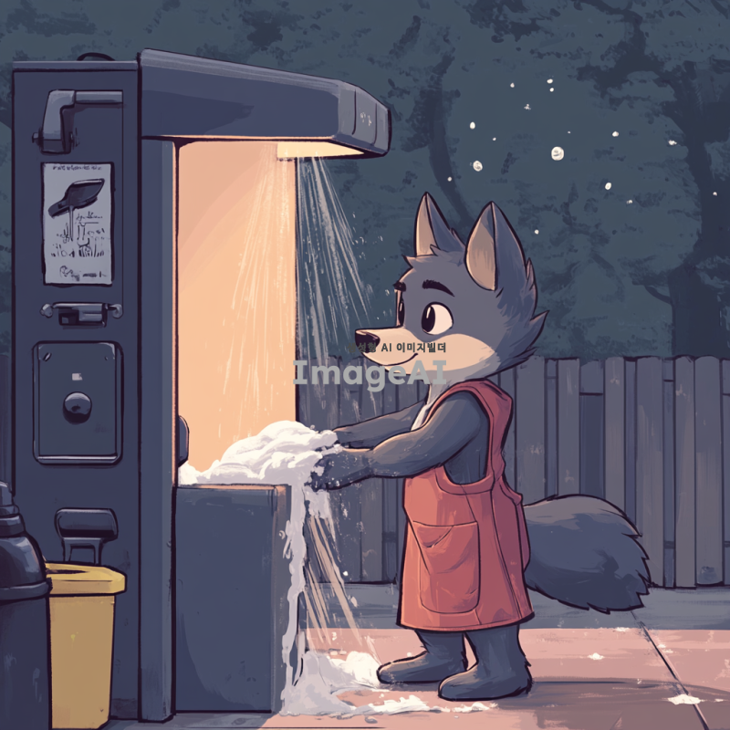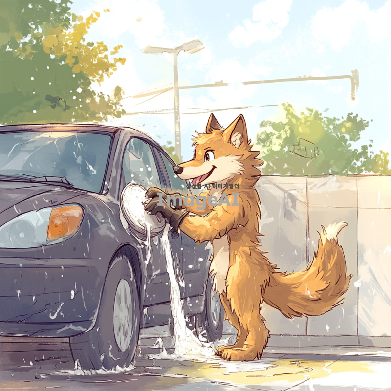 세차장에서 모닝을 귀여운 늑대가 세차를 하고 있는 모습