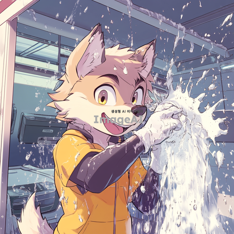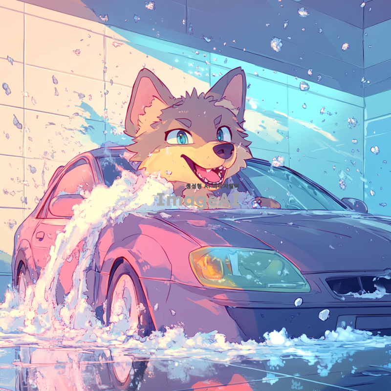 귀여운 늑대가 세차장에서 자동차 모닝을 물로 청소하는 장면, 늑대는 밝고 친근한 표정을 짓고 있으며, 물이 튀는 역동적인 모습, 세차장의 배경은 현대적이고 깔끔한 느낌, 자동차는 윤이 나고 깨끗한 상태로 묘사, 전체적으로 밝고 활기찬 분위기.