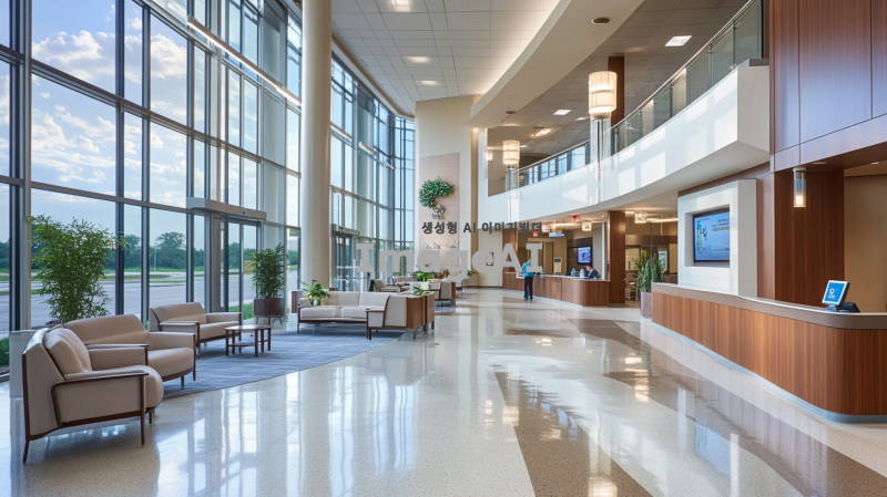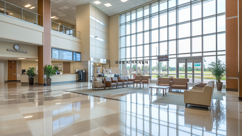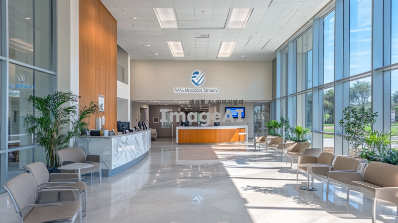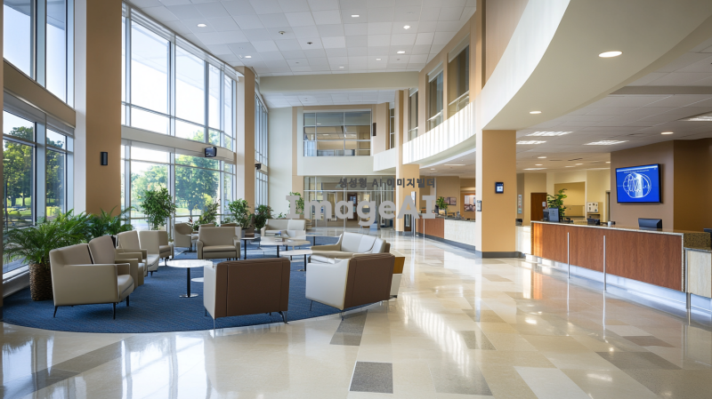 현대적인 병원 로비, 넓고 밝은 공간, 깨끗하고 정돈된 느낌, 대리석 바닥과 유리 벽, 편안한 대기 의자와 테이블, 자연 채광이 잘 들어오는 큰 창문, 식물 장식과 아트워크로 꾸며진 벽, 정보 데스크와 디지털 안내판, 고급스러운 인테리어, 조용하고 평화로운 분위기.