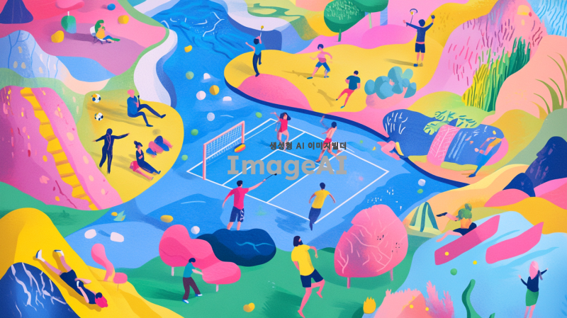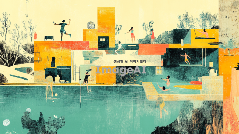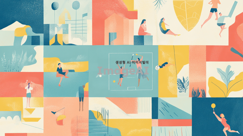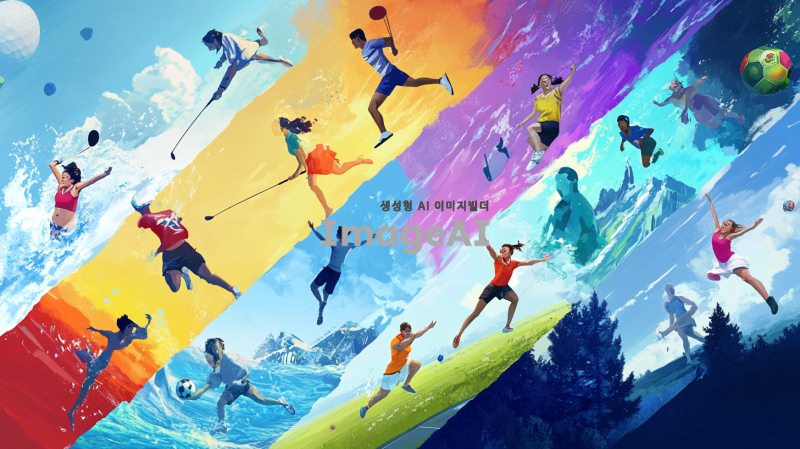 골프를 치는 사람의 작은 그림, 수영장에서 수영하는 사람의 작은 그림, 탁구를 치는 사람의 작은 그림, 축구를 하는 사람의 작은 그림, 요가 자세를 취하는 사람의 작은 그림, 줄넘기를 하는 사람의 작은 그림, 라인댄스를 추는 사람들의 작은 그림을 각각 그려내고, 이 모든 그림들이 자연스럽게 이어져 하나의 큰 이미지를 형성하는 장면. 각 활동은 서로 다른 배경과 색감을 가지며, 조화롭게 연결되어 전체적으로 활기찬 분위기를 표현.
