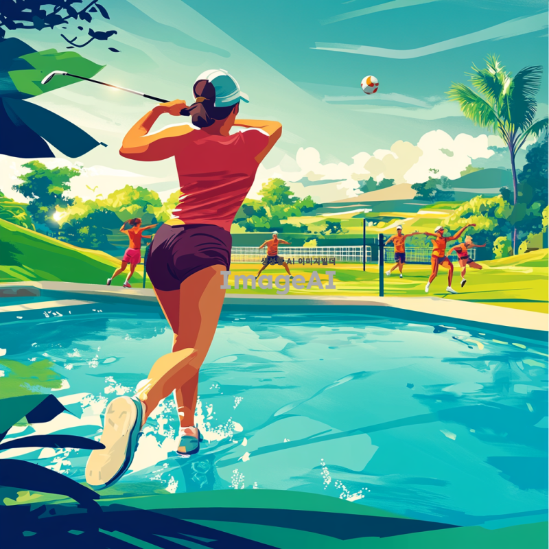 수영하는 사람, 맑고 푸른 수영장에서 자유형으로 수영하는 역동적인 모습, 물방울이 튀는 생생한 장면