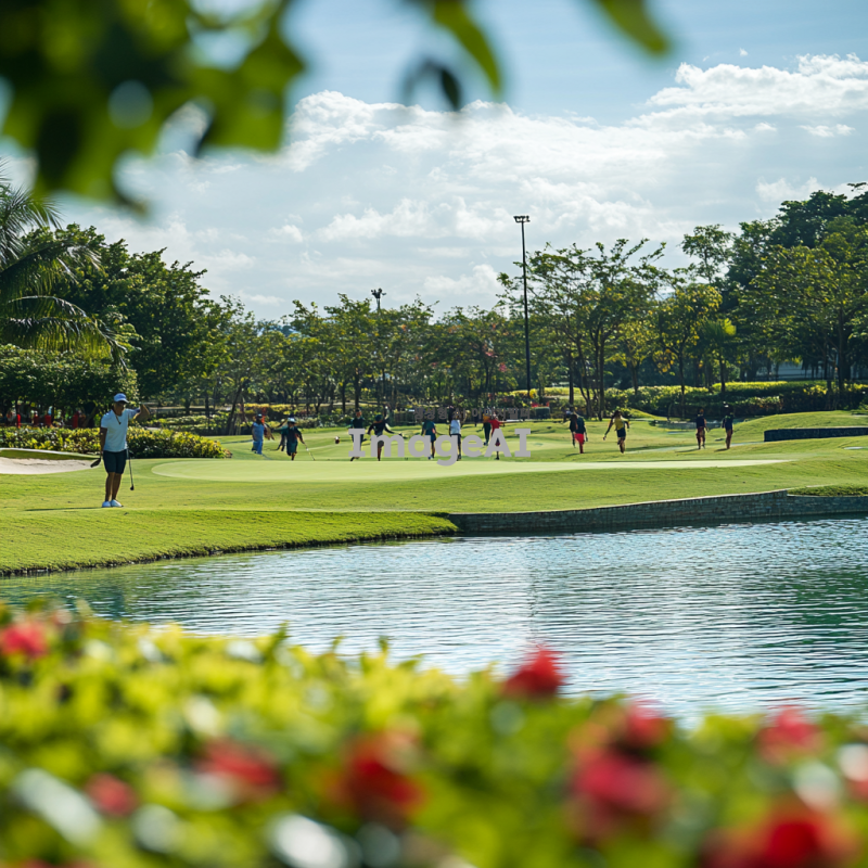 골프를 치는 사람, 푸른 잔디 위에서 진지한 표정으로 스윙을 준비하는 모습, 배경에는 맑은 하늘과 나무들이 펼쳐져 있는 골프장