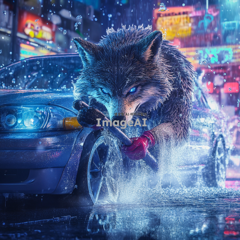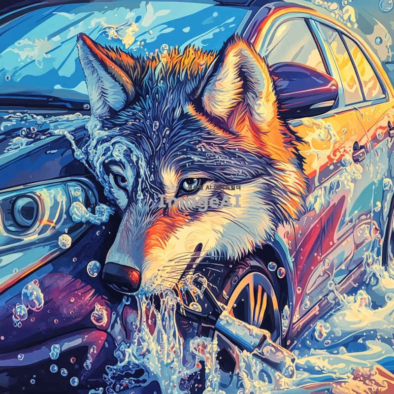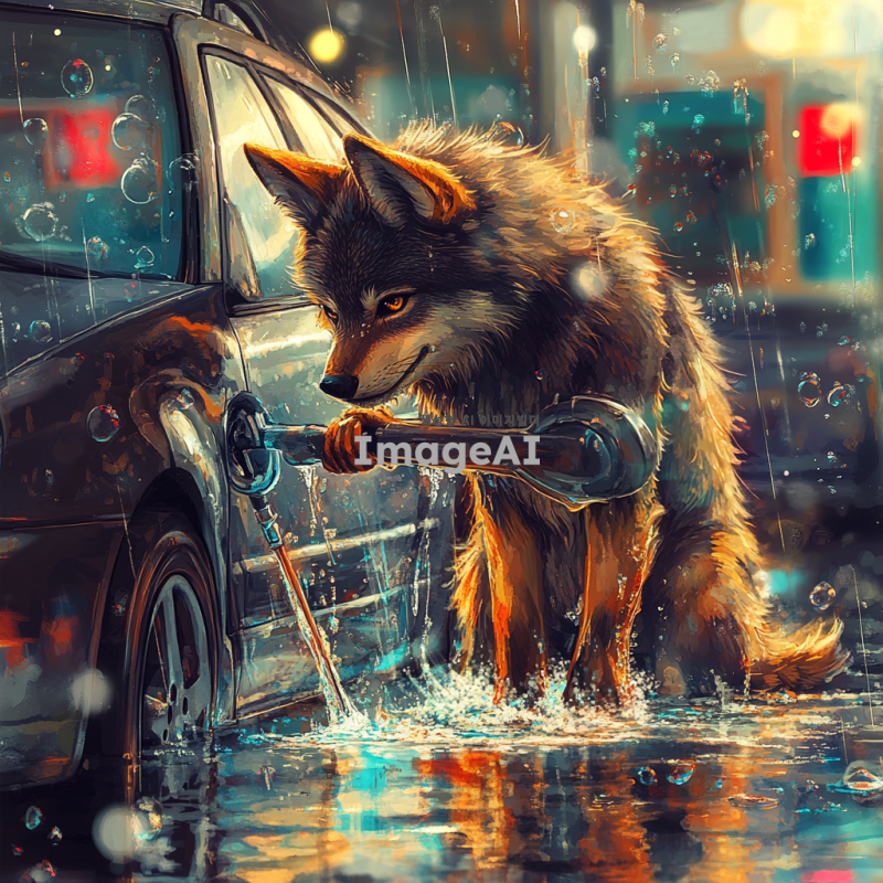 세차장에서 자동차를 청소하는 멋있는 늑대, 늑대는 세차 도구를 사용하며, 물과 비누 거품이 주변에 가득한 장면, 늑대의 털이 약간 젖어있고, 자동차는 현대적인 디자인, 배경은 세차장의 디테일이 잘 드러나도록 표현, 밝고 생동감 있는 색감.