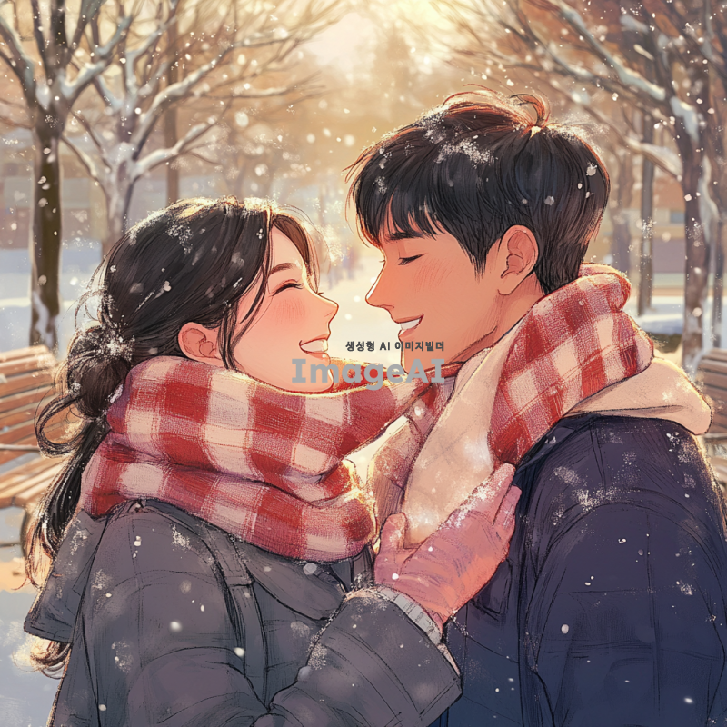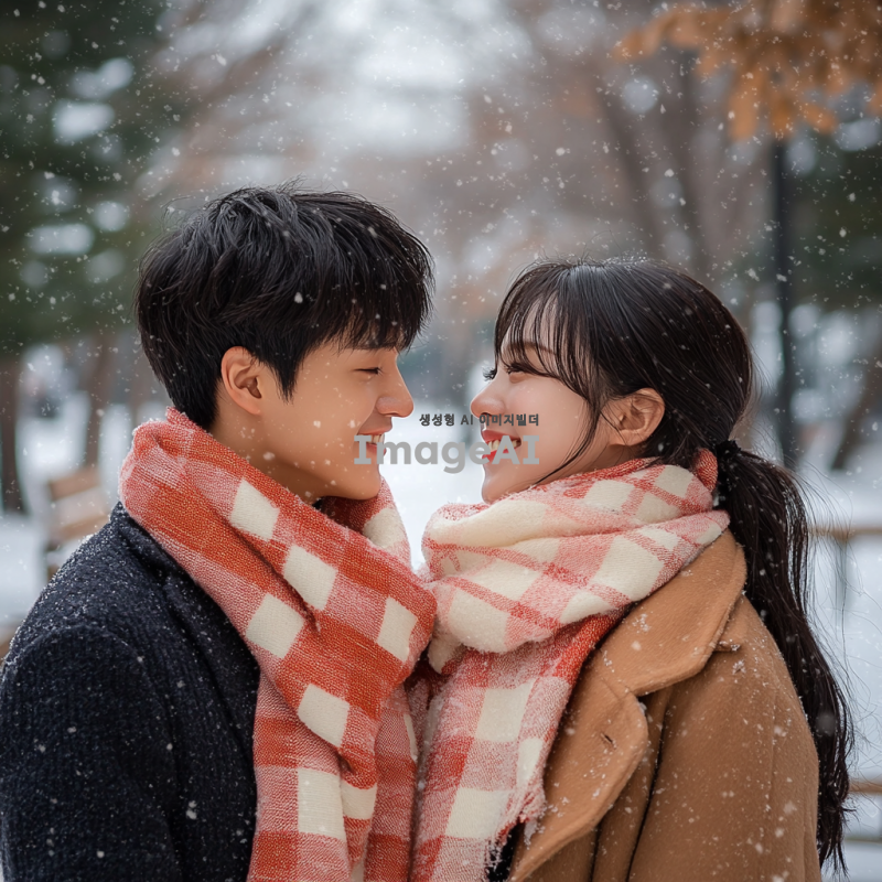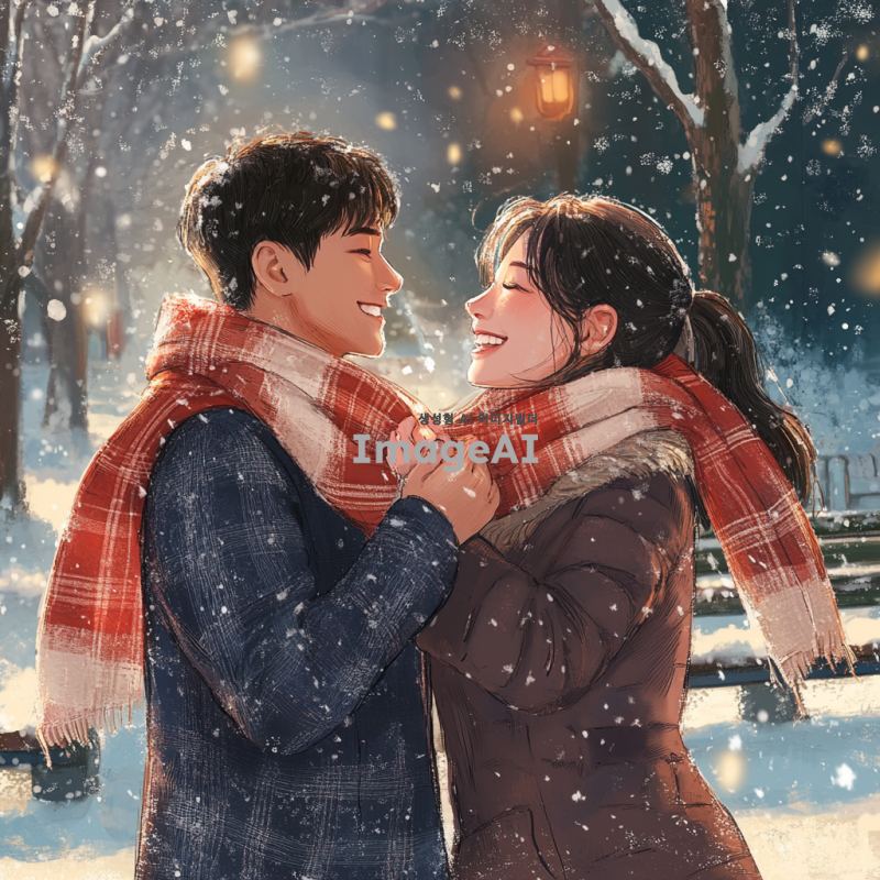 따뜻한 겨울 배경, 눈이 내리는 공원, 두 명의 한국인 연인이 서로를 바라보며 웃고 있음, 서로의 목에 커플 목도리를 메주고 있는 장면, 목도리는 빨간색과 크림색의 체크무늬, 연인의 표정은 행복하고 사랑스러움, 주변에는 눈 덮인 나무와 벤치, 부드러운 겨울 햇살이 비치는 분위기, 로맨틱하고 포근한 느낌.