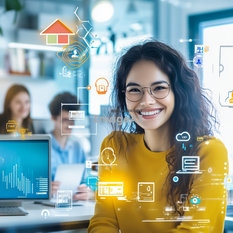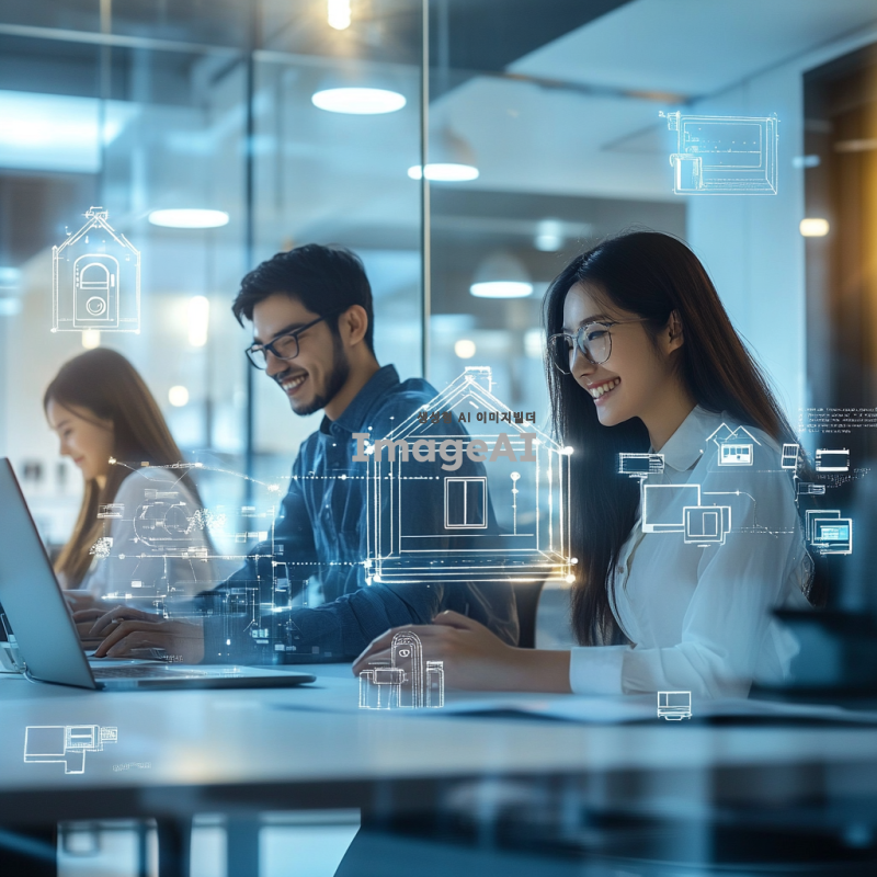 홈앤서비스의 로고와 함께 밝고 친근한 분위기의 사무실 배경, SK브로드밴드와 ADT 캡스의 상징적인 요소들이 조화롭게 배치된 모습, 직원들이 활기차고 열정적으로 일하는 장면, 따뜻한 색감과 심플한 디자인, 행복과 책임감을 표현하는 미소 짓는 직원들, 기술과 보안 서비스의 조화를 상징하는 아이콘들이 포함된 이미지.