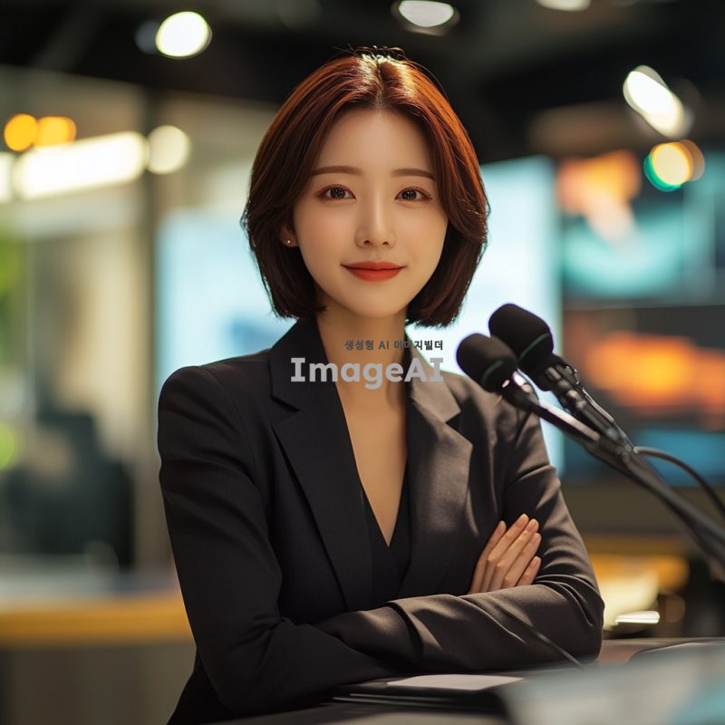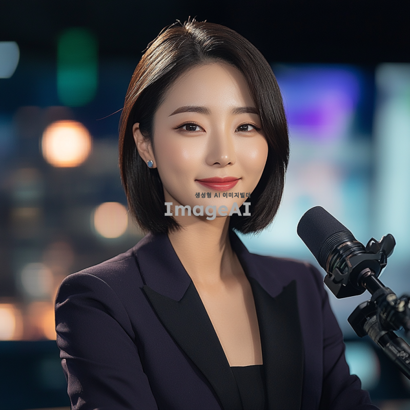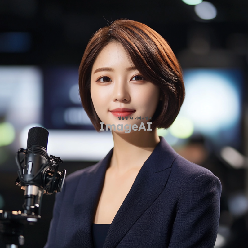 뉴스 스튜디오 배경, 단정한 단발머리의 한국인 여성 뉴스 진행자, 얼굴만 최대한 크게 나오게 깔끔한 정장 차림, 차분한 미소, 카메라를 바라보는 모습, 전문적이고 신뢰감 있는 분위기, 조명이 잘 맞춰진 스튜디오 환경, 고급스러운 느낌의 마이크 배치.