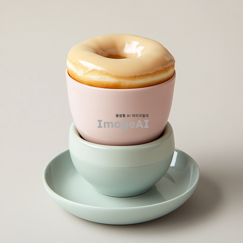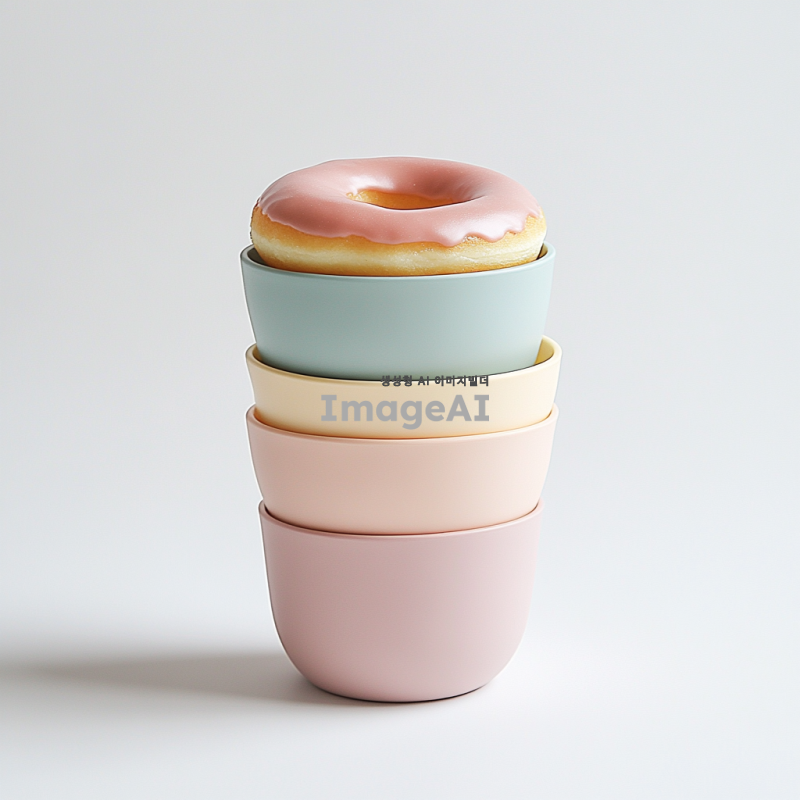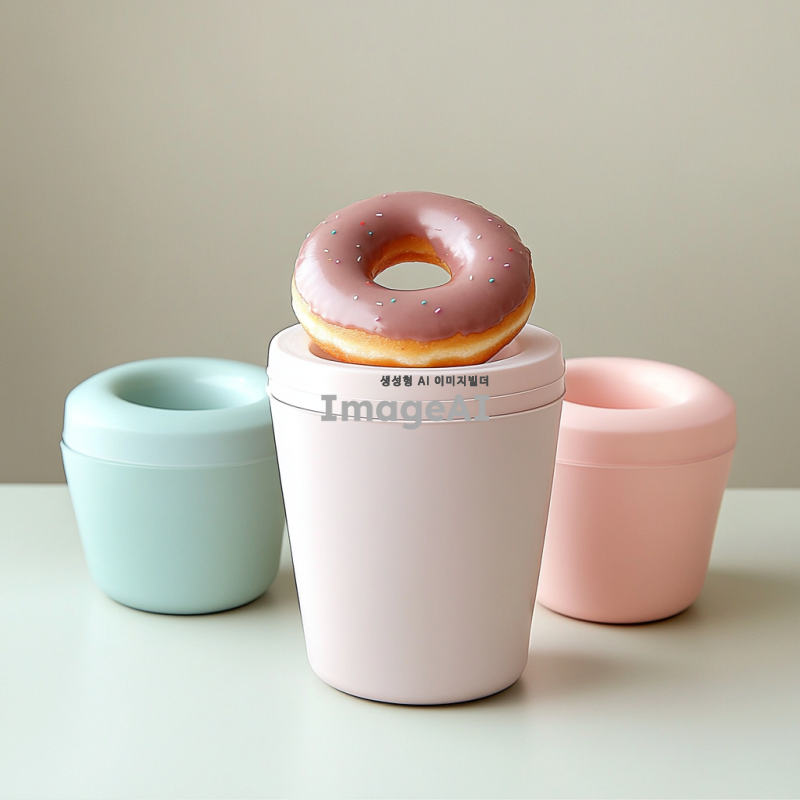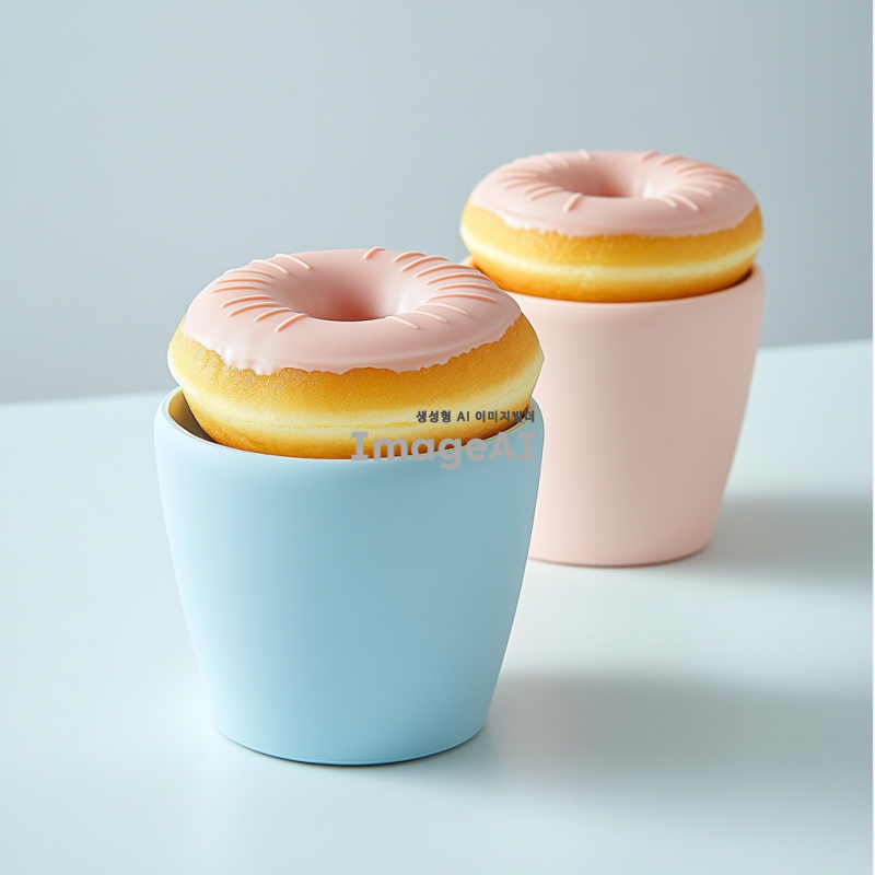 카페 테이크아웃컵을 거꾸로 뒤집은 형태로 디자인, 윗부분에 도넛을 끼울 수 있는 구조, 컵의 아랫부분은 평평하고 안정적인 받침대 역할, 컵의 소재는 재활용 가능한 친환경 플라스틱, 도넛과 컵의 색상은 조화를 이루는 파스텔톤, 모던하고 세련된 디자인, 한국 카페 문화에 어울리는 스타일, 실용성과 디자인을 겸비한 혁신적인 상품.