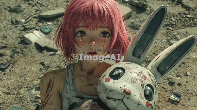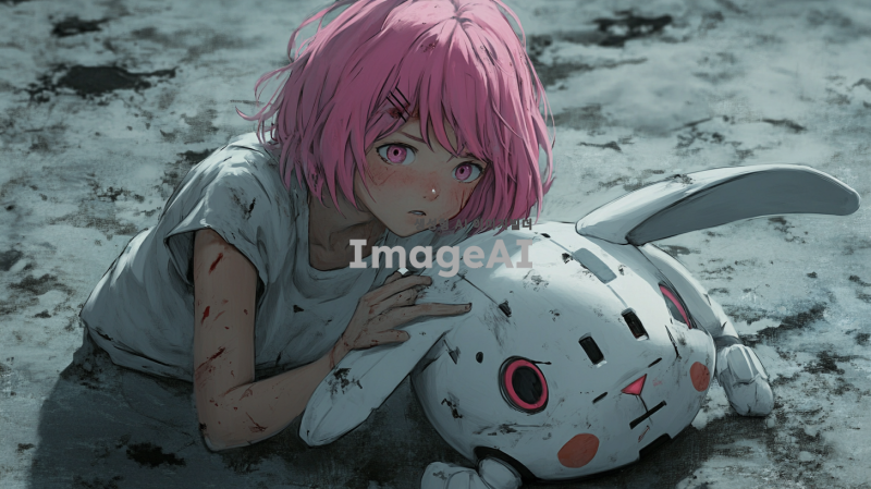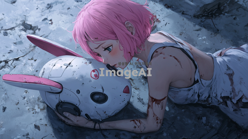 황량한 전장에서 쓰러져 있는 토끼 외형의 전투형 로봇을 안고 있는 분홍색 단발 머리의 여자 아이, 아이의 눈에는 눈물이 가득 차 있으며 슬픔이 가득한 표정을 짓고 있다. 주변에는 전투의 흔적이 남아 있으며, 아이의 옷은 전투로 인해 약간 더러워져 있다. 로봇의 표면에는 긁힌 자국과 손상이 보인다.