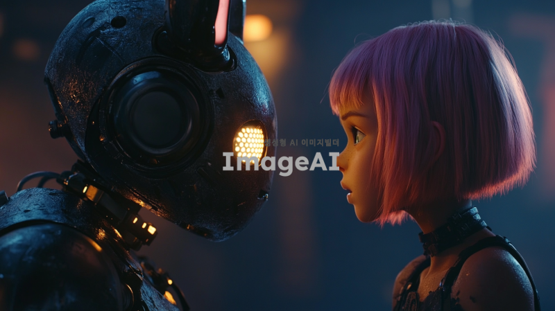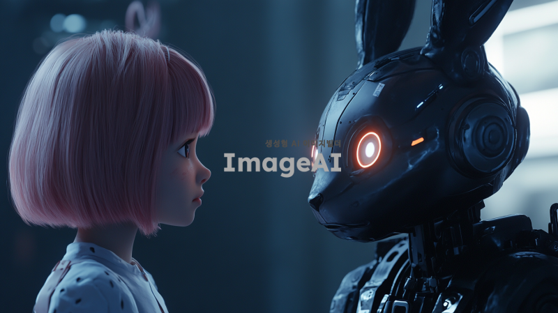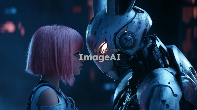 어두운 배경 속에 분홍색 단발 머리를 가진 여자 아이가 슬픈 표정으로 토끼 외형의 전투형 로봇과 얼굴을 맞대고 있다. 로봇은 금속 질감의 몸체에 부드러운 토끼 귀를 가지고 있으며, 눈은 LED처럼 빛나고 있다. 두 캐릭터는 서로의 감정을 공유하며 깊은 대화를 나누는 듯한 분위기다. 장면은 감정적이고 애틋한 분위기로, 배경은 흐릿하게 처리되어 두 캐릭터에 집중할 수 있도록 한다.