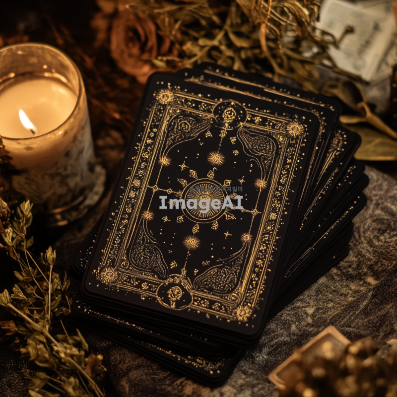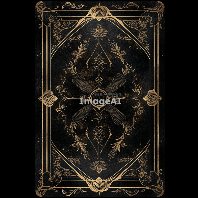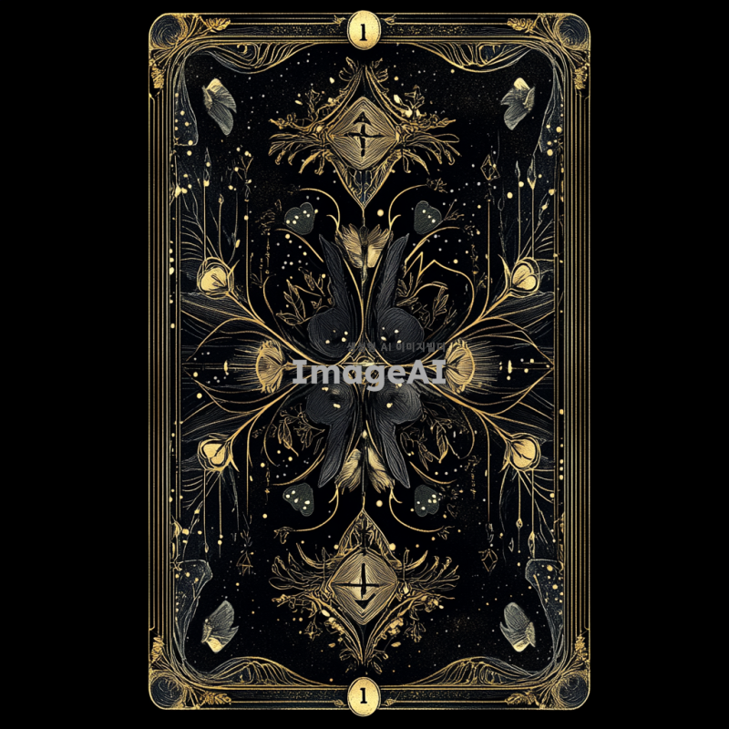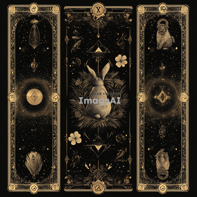 신비롭고 고풍스러운 타로카드 뒷면 디자인, 클로버와 슈나우저 토끼의 그림이 섞여있고 복잡한 기하학적 패턴과 자연 요소가 어우러진 모습, 어두운 배경에 금색과 은색의 세밀한 장식, 마법적이고 신비로운 분위기, 고대의 상징과 문양이 조화롭게 배치된 디자인, 고급스러운 질감과 깊이감을 강조