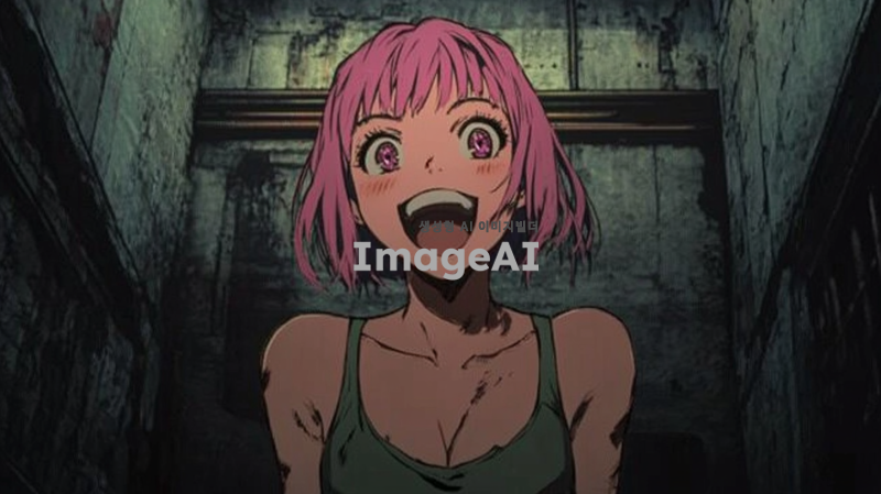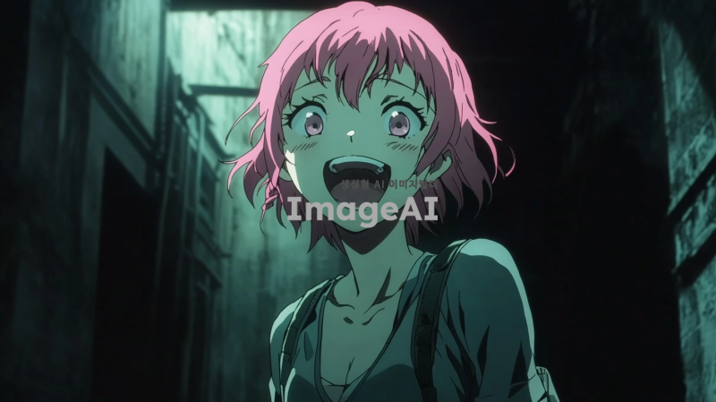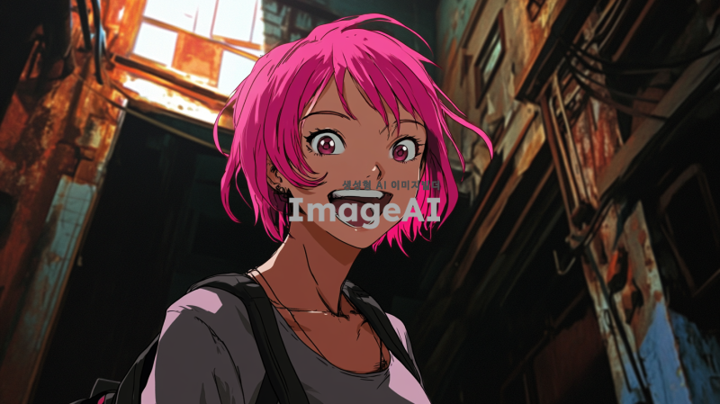 분홍 단발 머리를 가진 여자 아이가 설레는 표정으로 서 있는 장면, 배경은 어두운 톤의 범죄 조직 본거지, 주변은 낡은 벽과 희미한 조명, 긴장감 있는 분위기, 소녀의 얼굴에는 미소가 가득하고 눈은 반짝임, 복장은 캐주얼한 스타일.
