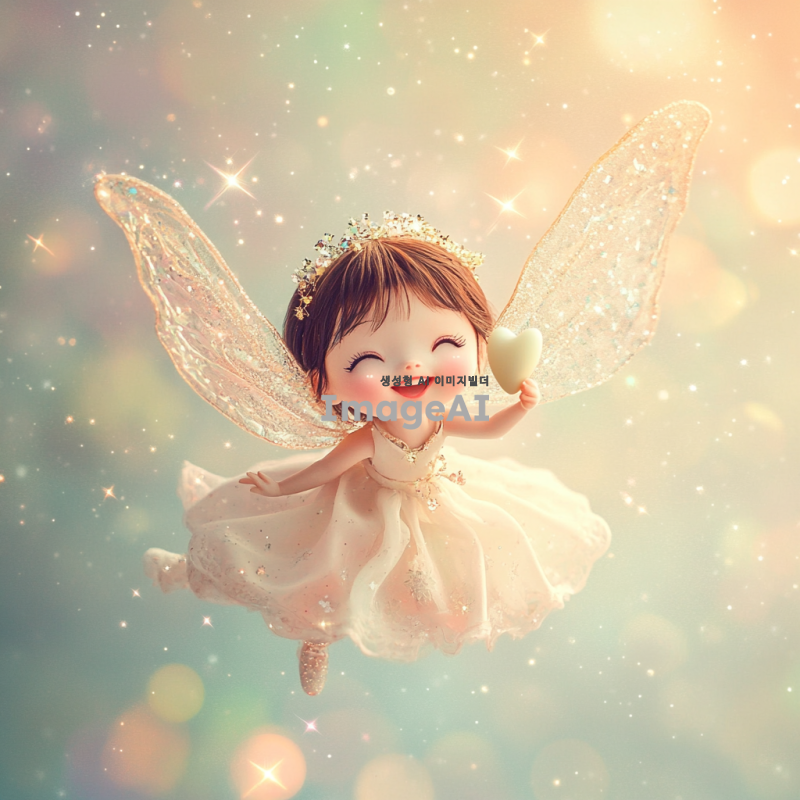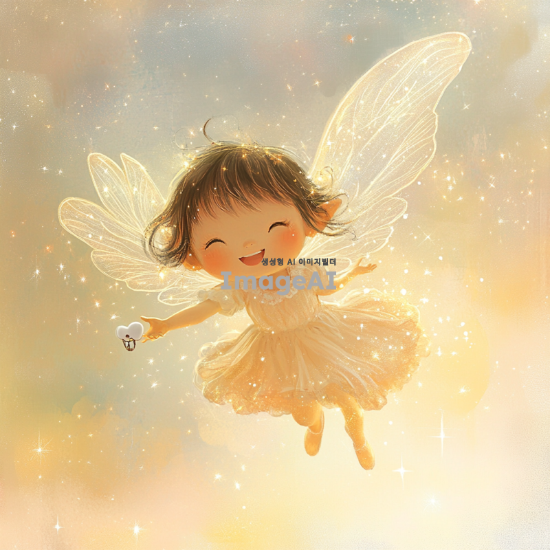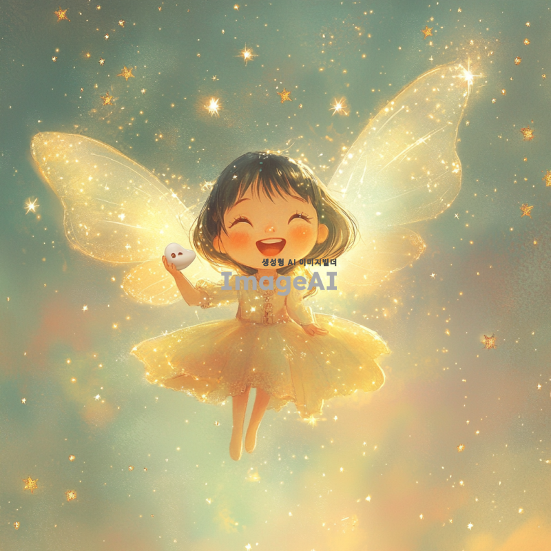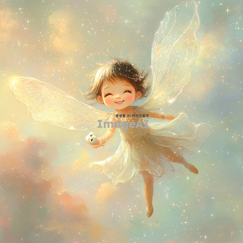 환상적인 느낌의 한국인 이빨 요정을 묘사합니다. 반짝이는 날개를 가진 작은 요정, 밝고 환한 미소를 지으며 하늘을 날고 있습니다. 요정의 주변에는 작은 별빛들이 반짝이고 있으며, 요정의 손에는 작은 이빨이 들려 있습니다. 배경은 부드럽고 몽환적인 파스텔 톤의 하늘이며, 요정의 옷은 반짝이는 실크 소재로 만들어져 있습니다. 요정의 머리카락은 부드럽게 바람에 날리며, 전체적으로 마법적이고 환상적인 분위기를 자아냅니다.
