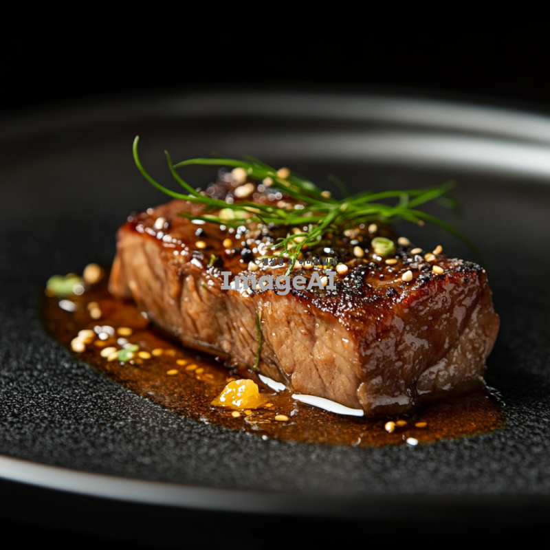 고급스러운 검정 접시 위에 굽기전 한우 살치살 한입크기 조명은 밝고 부드럽게 설정되어 음식의 질감을 강조한다.