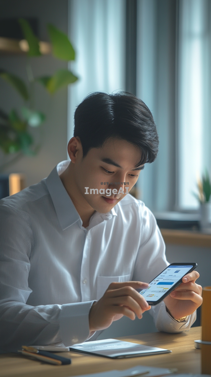 한국인 남성이 현대적인 디자인의 사무실 책상에 앉아 있으며, 손가락으로 스마트폰 화면의 코인 매수 버튼을 누르고 있다. 스마트폰 화면은 밝게 빛나고 있으며, 화면에 코인 그래프와 매수 버튼이 강조되어 보인다. 남성은 집중한 표정으로 화면을 바라보고 있으며, 주변에는 깔끔한 사무실 용품이 놓여 있다. 자연광이 창문을 통해 들어와 방 안을 밝히고 있다.