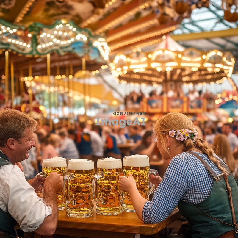 독일 뮌헨의 옥토버페스트 축제 현장, 전통적인 독일 맥주 텐트 내부, 커다란 맥주잔을 들고 즐거워하는 사람들, 전통적인 바이에른 의상을 입은 남성과 여성, 활기찬 분위기, 다양한 독일 음식과 장식들, 배경에는 축제의 상징적인 회전목마와 놀이기구, 가을의 따뜻한 색감.