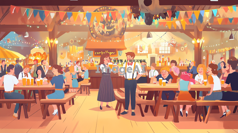 옥토버페스트를 배경으로 한 활기찬 맥주 축제 장면. 전통적인 독일 바이에른 스타일의 맥주 텐트 내부, 긴 나무 테이블과 벤치에 앉아 있는 다양한 연령대의 한국인 방문객들, 독일 전통 의상인 디른들과 레더호젠을 입고 있는 사람들, 큰 맥주잔을 들고 웃고 있는 모습, 배경에는 풍성한 장식과 화려한 조명이 어우러진 축제 분위기, 무대에서 연주하는 전통 독일 음악 밴드, 주변에는 다양한 독일 전통 음식과 간식들이 진열된 모습.