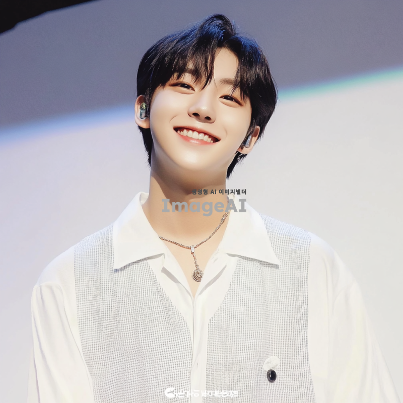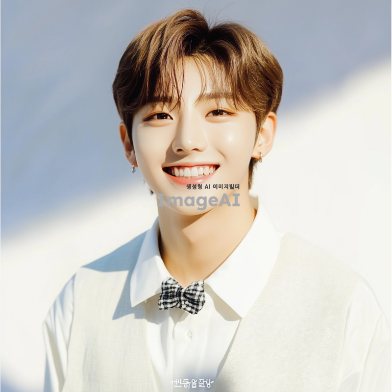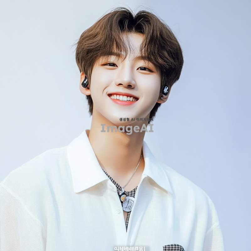k-pop 아이돌스러운 하얗고, 귀여운 얼굴의 한국 고등학생 남자, 청량하게 웃고 있으며 흰색 셔츠를 입고 흰색 배경 앞에 서있다. 입덕멤버이다.