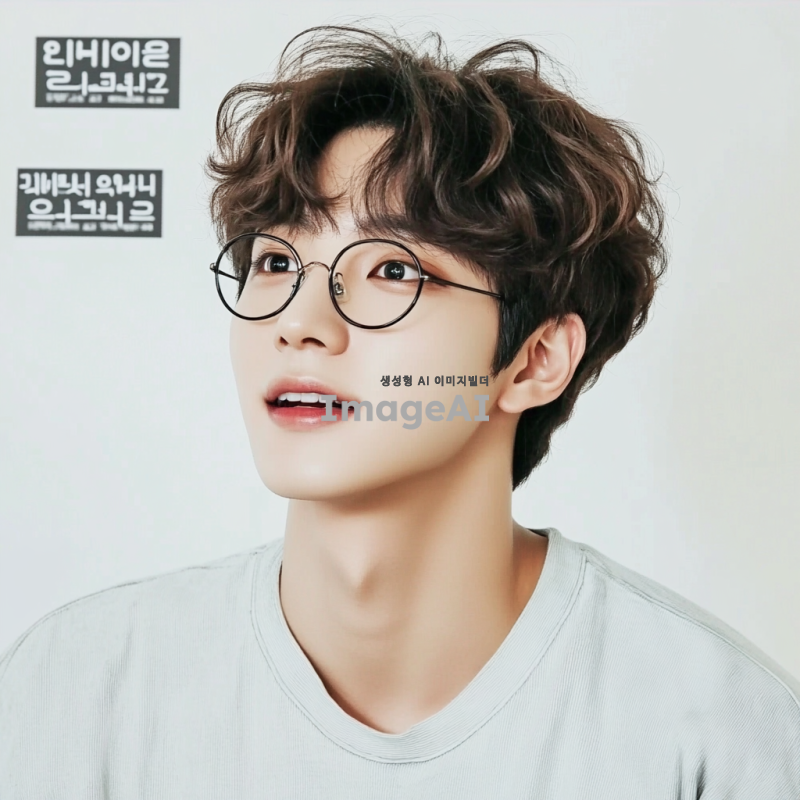 검은 머리를 가진 젊은 k-pop 아이돌 남자가 셔츠를 입고, 흰색 배경앞에서 포즈를 취하고 있다. 그는 짧은 곱슬머리를 하고 있고, 그는 미소 짓고 있다. 그는 잘생겼고, 귀여우며, 검은 뿔테 안경을 쓰고 있다.