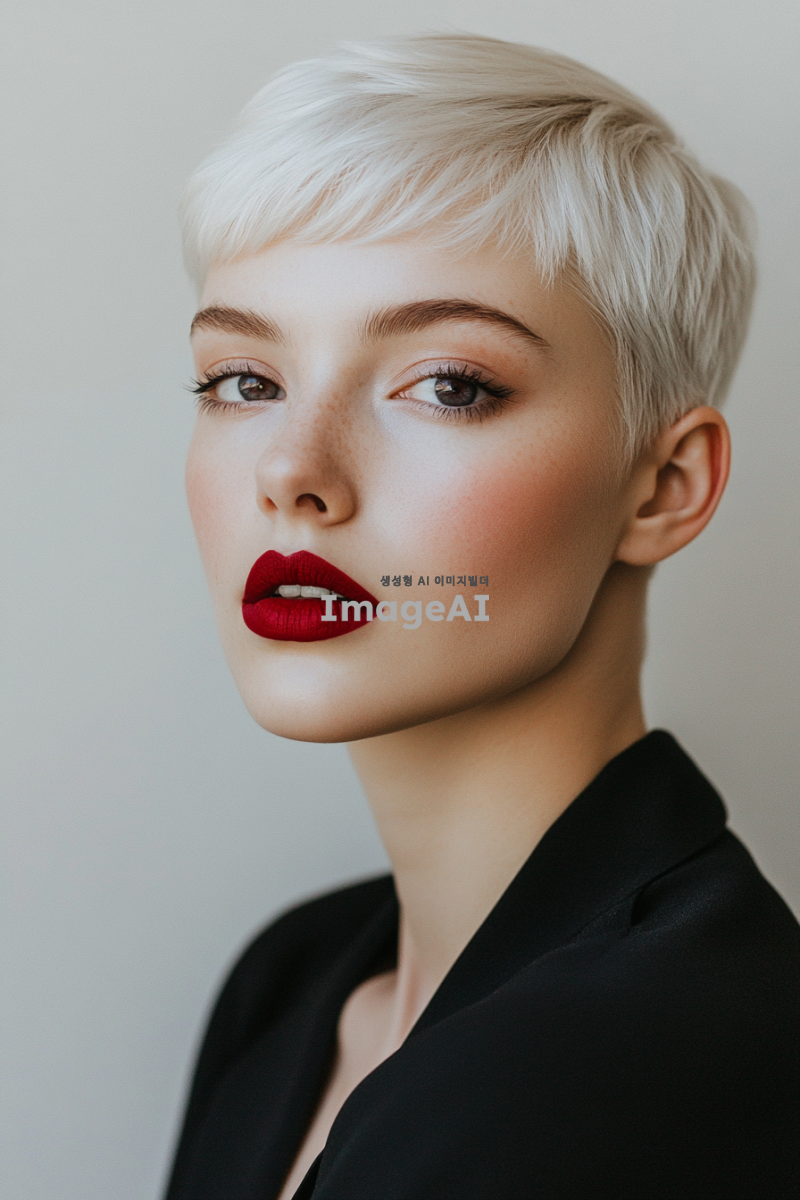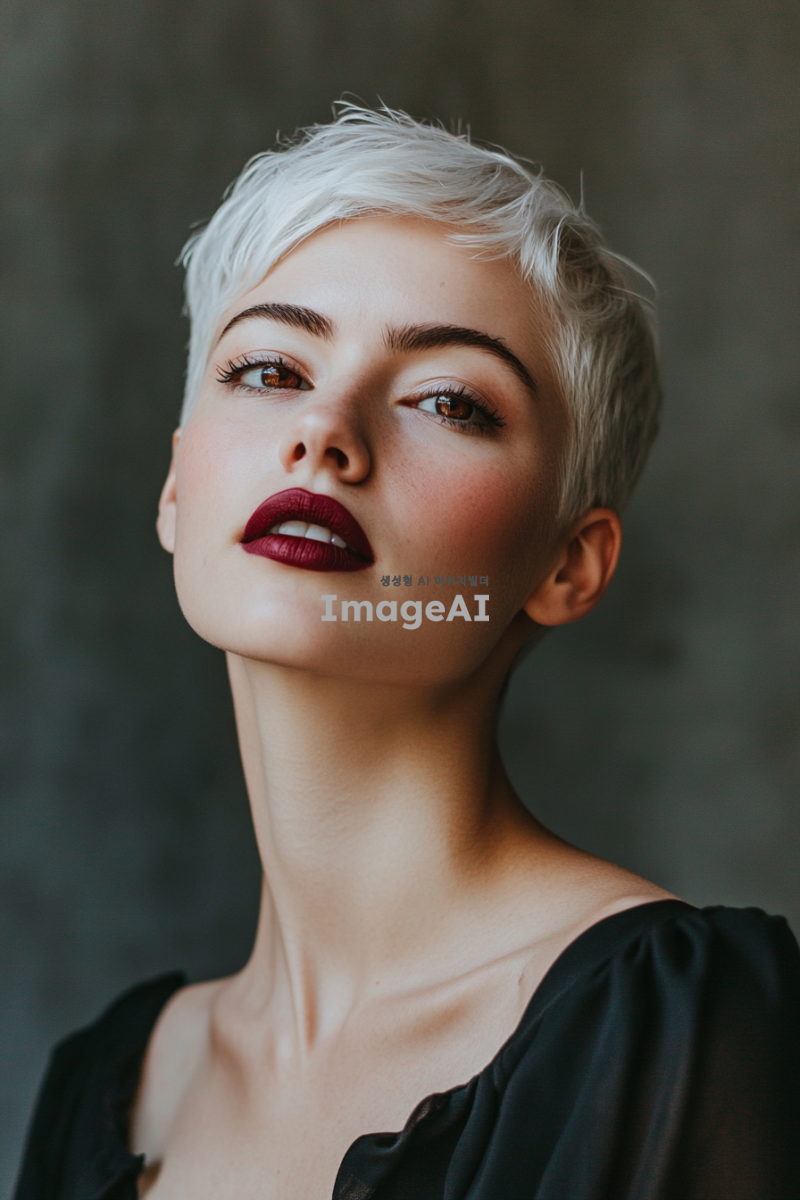 30대 여성, 흰색 단발머리, 빨간 눈, 보라색 입술, 현대적이고 세련된 스타일, 차분한 배경, 자연스러운 조명.