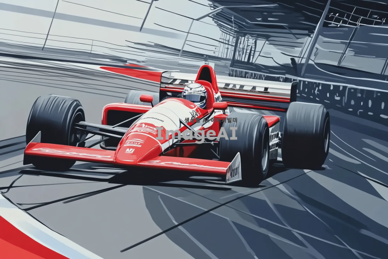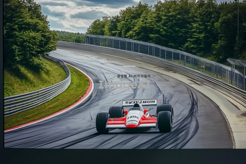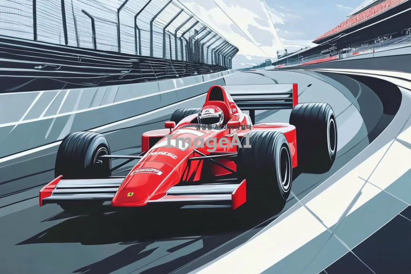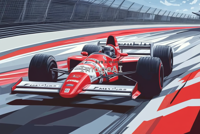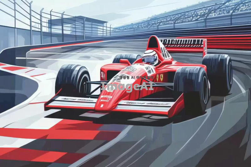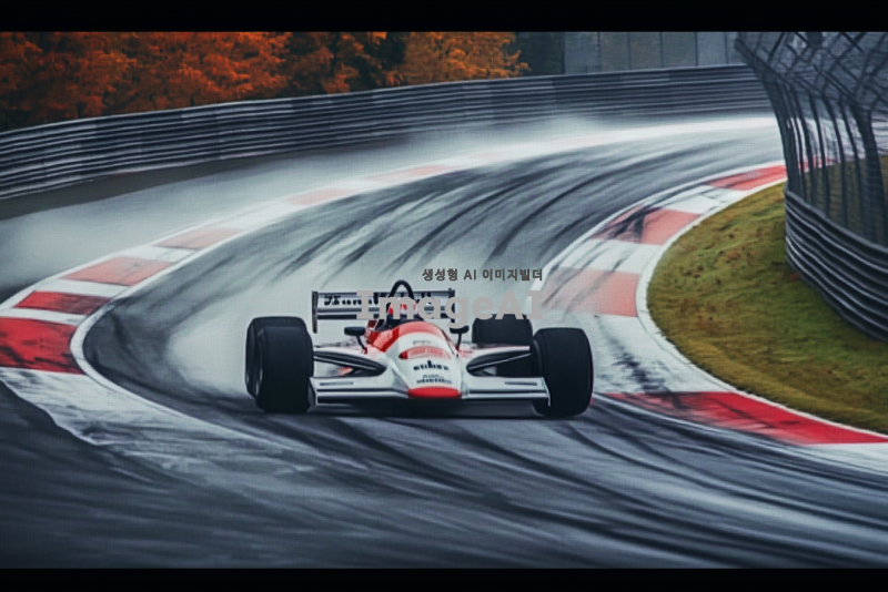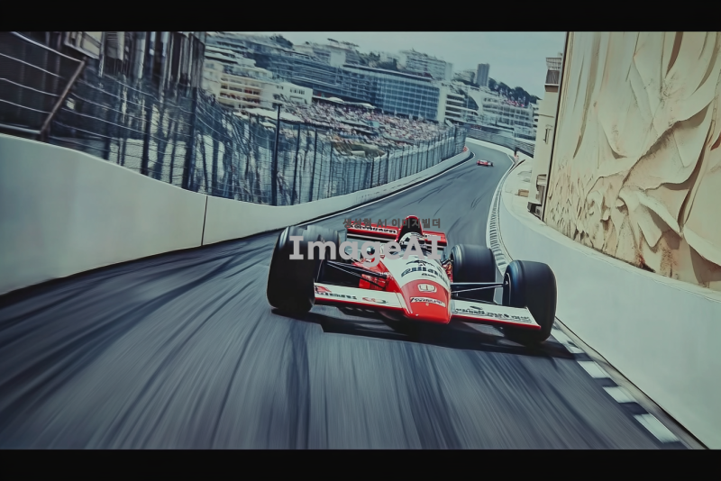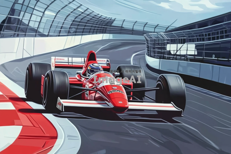 f1 경기장의 풍경, 빠르고 역동적인 도로 위의 레이싱 장면, 경주 차 하나가 곡선을 주행하고 있는 장면 연출
