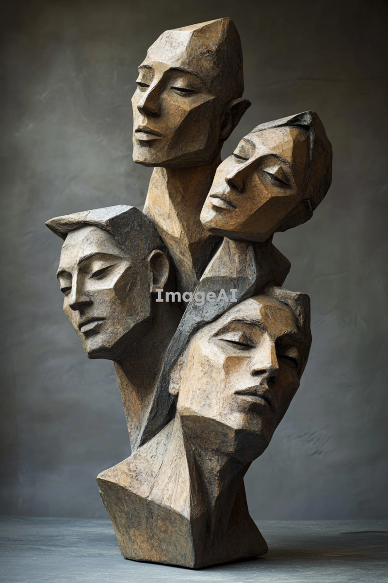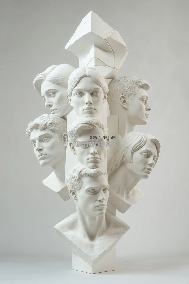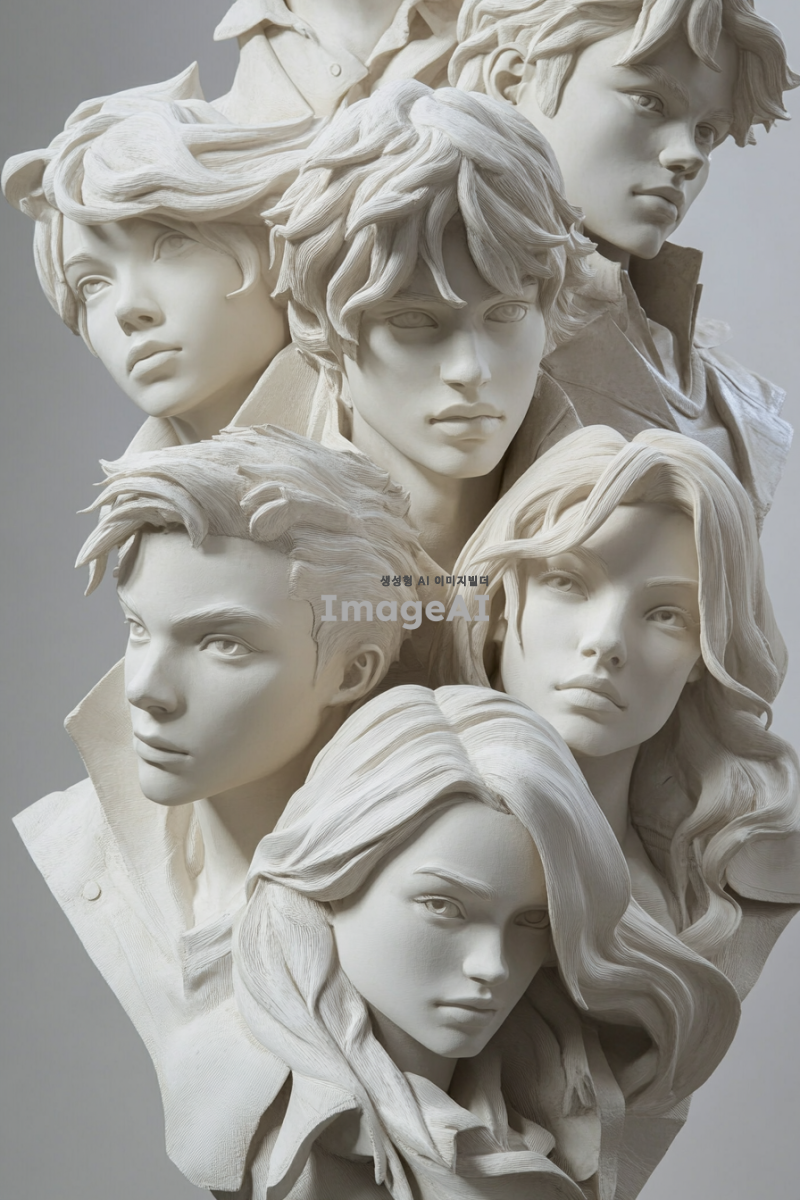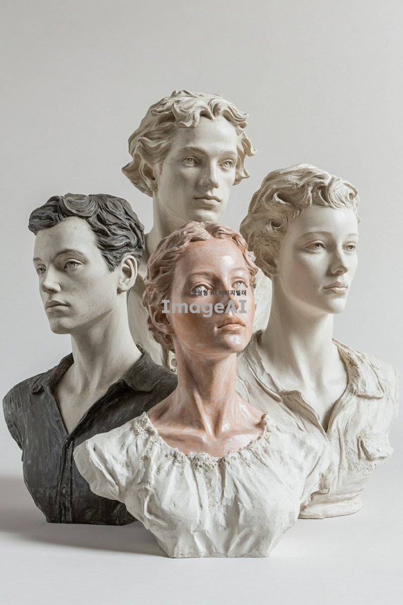 20대남자둘과 20대여자셋의 흉상이 다이아몬드형대로 배열된어있다. 활동적이고 역동적인 모습들이고 모두 밝은표정.
