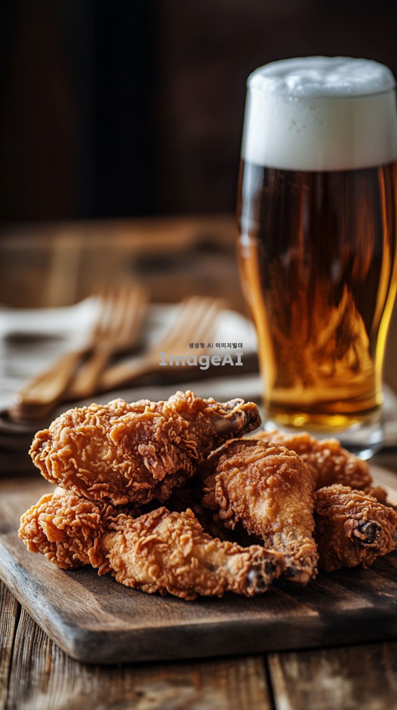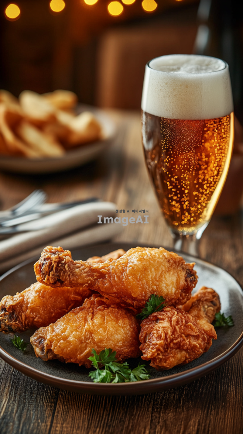 따뜻한 조명 아래 나무 식탁 위에 놓인 바삭한 후라이드 치킨과 시원한 맥주. 치킨은 황금빛으로 튀겨져 있으며, 바삭한 껍질이 돋보인다. 맥주는 투명한 유리잔에 담겨 있으며, 잔 위로 하얀 거품이 풍성하게 올라와 있다. 주변에는 간단한 식기와 냅킨이 놓여져 있어 식사의 분위기를 더한다.