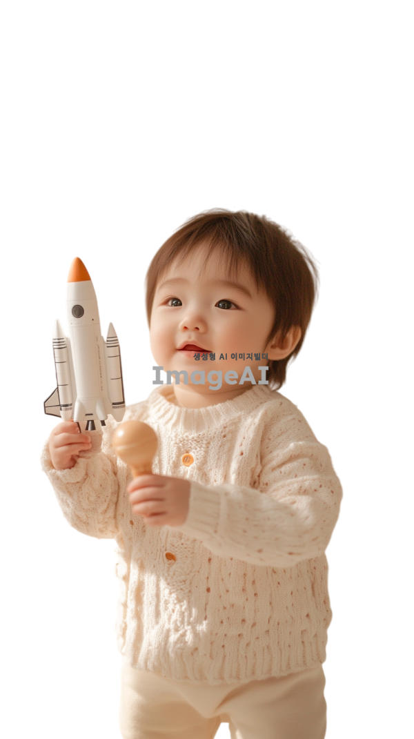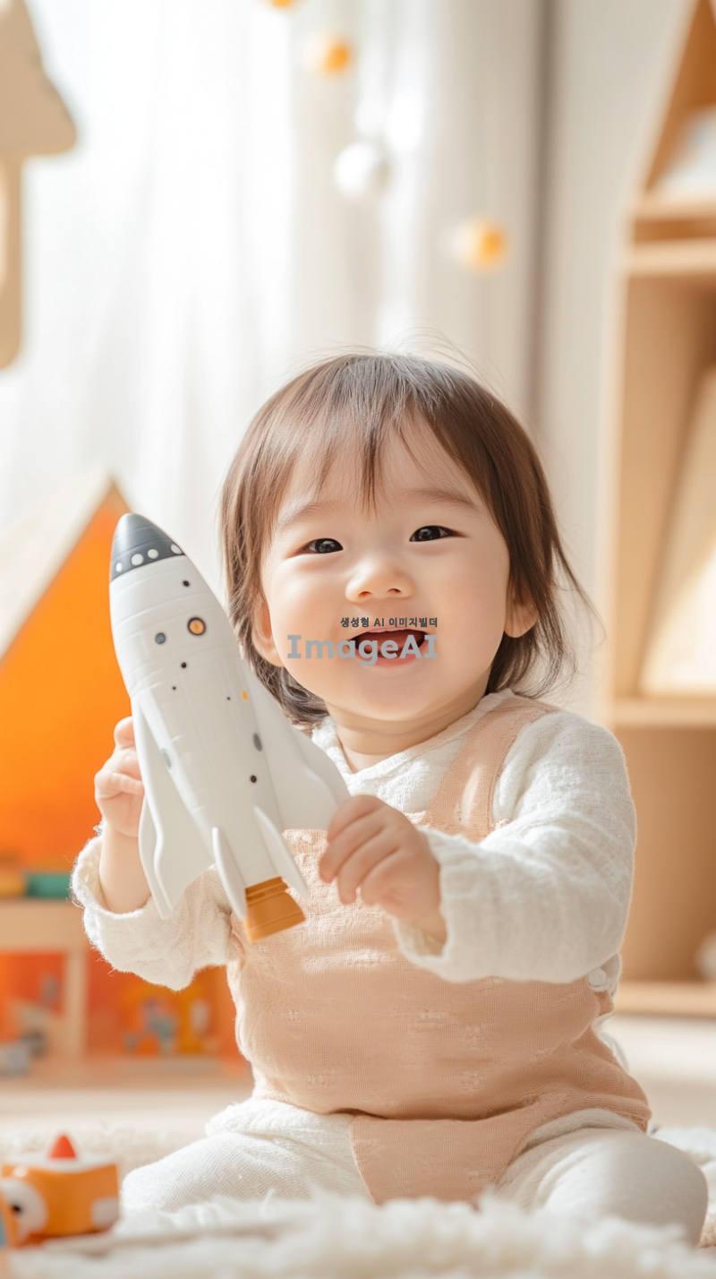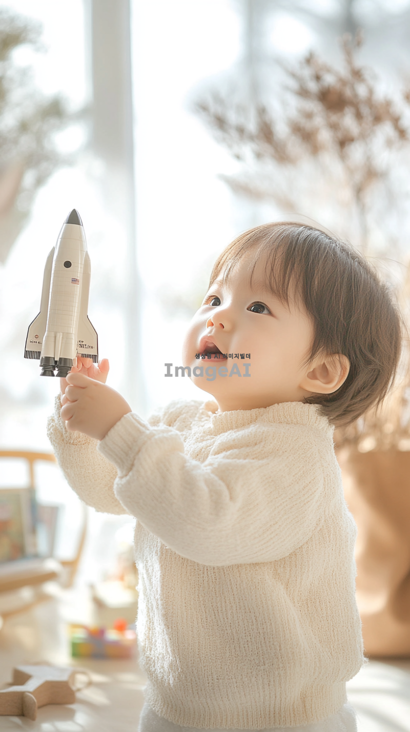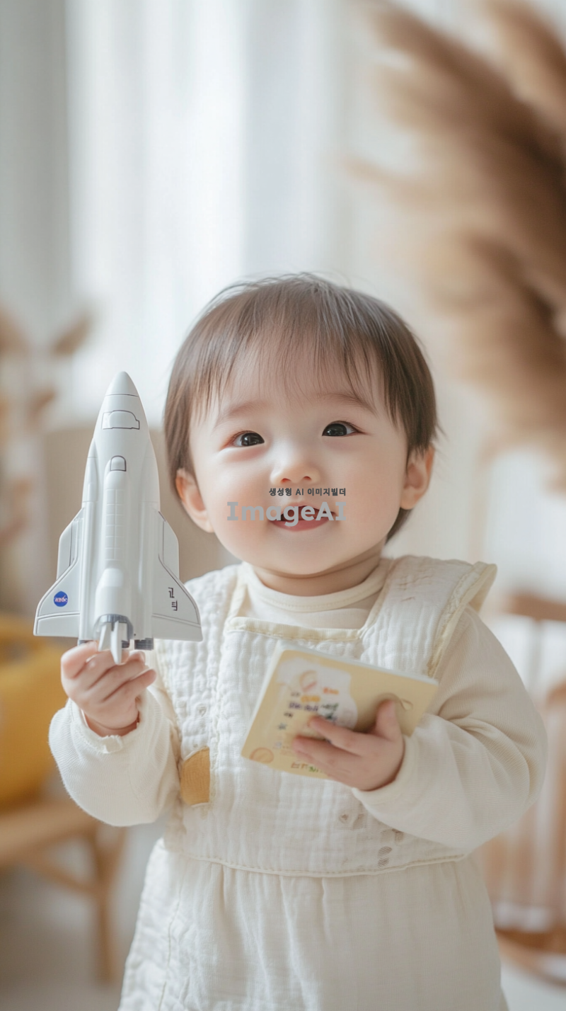 우주 비행기 피규어를 손에 쥔 귀여운 한국 아기, 밝고 따뜻한 실내 공간, 아기의 얼굴에 호기심과 기쁨이 가득한 표정, 자연광이 부드럽게 비치는 환경, 아기의 옷은 부드러운 파스텔 톤, 주변에 장난감과 책들이 놓여 있는 아늑한 분위기.