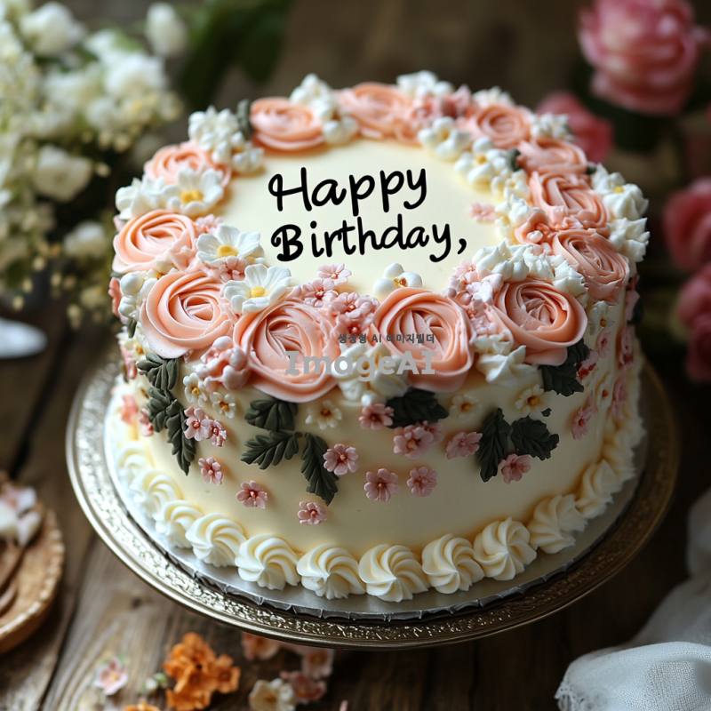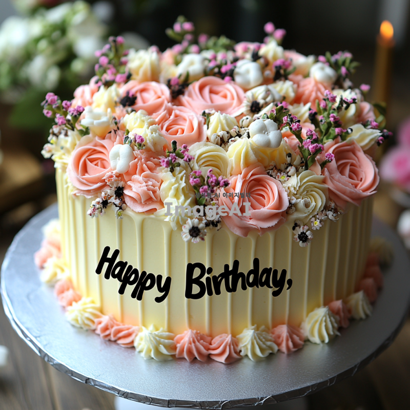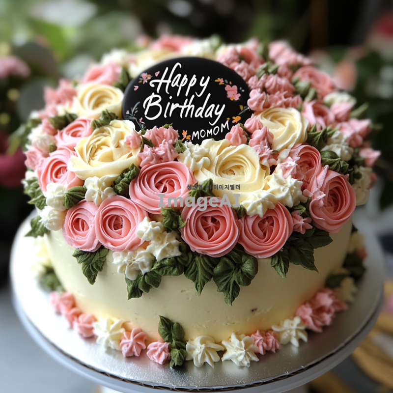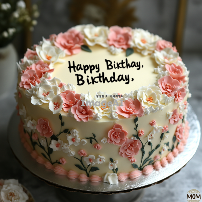 1호 사이즈의 케이크, 흰색 꽃과 분홍색 꽃으로 장식된 모습, 케이크 위에 "Happy Birthday, MOM"이라는 검은색 글자가 쓰여 있는 장면, 화사하고 따뜻한 분위기, 세련되고 우아한 스타일.