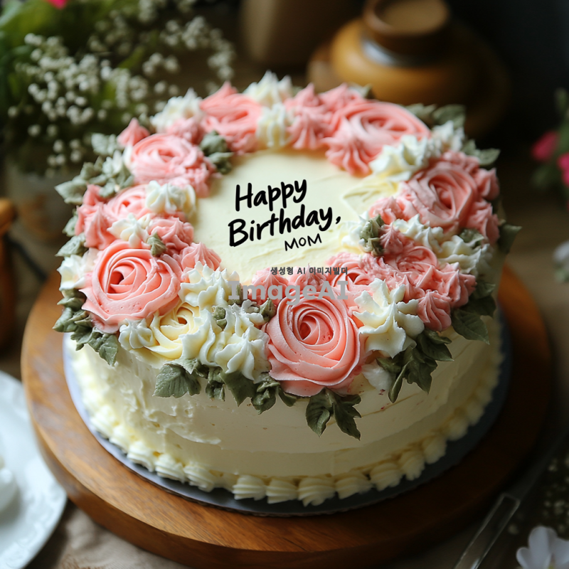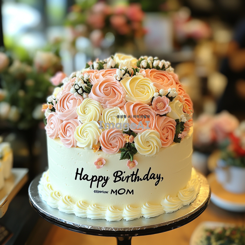 1호 사이즈 케이크, 흰색꽃과 분홍색꽃으로 아름답게 장식된 디자인, 케이크 표면에 "Happy Birthday, MOM"이라는 검은색 글자, 전체적으로 우아하고 사랑스러운 분위기, 한국 스타일의 케이크 디자인.
