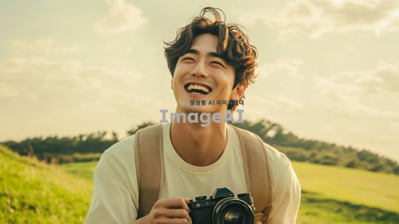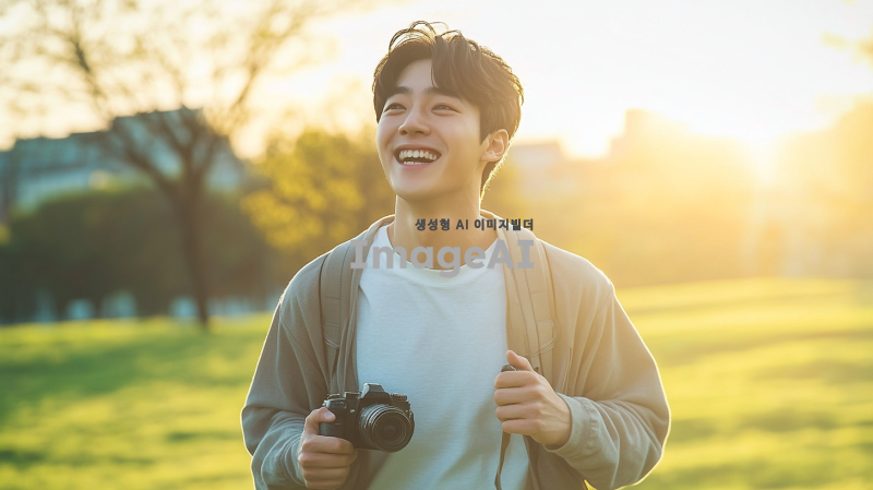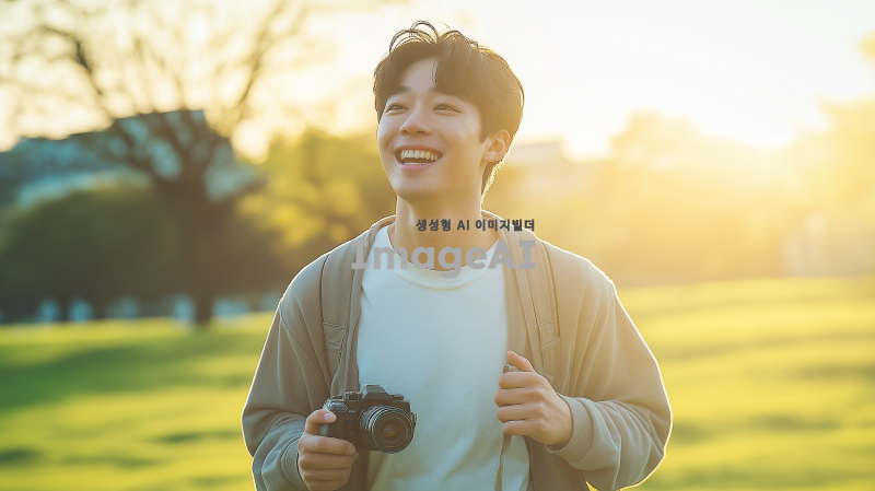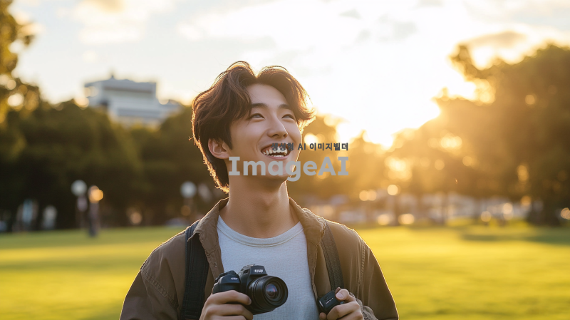 밝고 화사한 날씨 속에서 푸른 하늘을 배경으로, 카메라를 들고 활짝 웃으며 힘차게 달려가는 20대 한국인 남성. 그의 표정은 희망과 긍정적인 에너지를 가득 담고 있으며, 주변에는 초록색 잔디밭이 펼쳐져 있다. 그의 옷차림은 캐주얼하고 편안하며, 머리카락은 바람에 살짝 흩날리는 모습이다. 전체적인 분위기는 활기차고 생동감 넘치는 느낌을 준다.