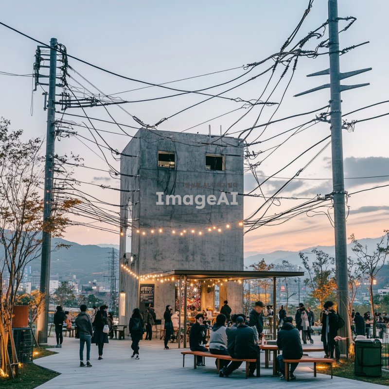 미래지향적이고 예술적인 외관을 가진 랜드마크형 변전소 건물, 전기가 흐르는 듯한 효과로 송전탑을 따라 연결된 전선, 변전소를 배경으로 사진을 촬영하는 사람들, 바로 옆 노천카페에서 커피를 마시며 여유로운 모습을 즐기는 사람들, 현대적이고 활기찬 분위기.