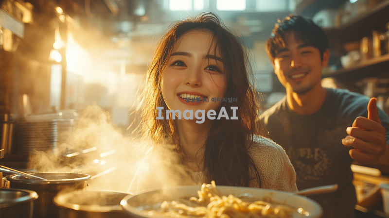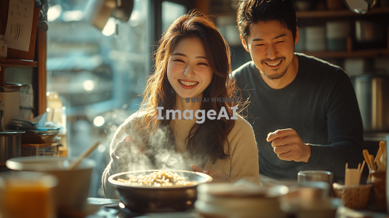 따뜻한 주방에서 라면을 먹고 있는 아내, 아내는 행복한 표정으로 라면을 즐기고 있으며, 남편은 뒤에서 무릎을 꿇고 손을 들고 있는 모습. 아내는 긴 머리를 가진 한국 여성이고, 남편은 짧은 머리를 가진 한국 남성. 주방은 현대적인 스타일로 꾸며져 있으며, 창문을 통해 햇빛이 들어오는 아늑한 분위기. 아내의 앞에는 김이 나는 라면 그릇이 놓여 있고, 남편은 웃으며 아내를 바라보고 있음.