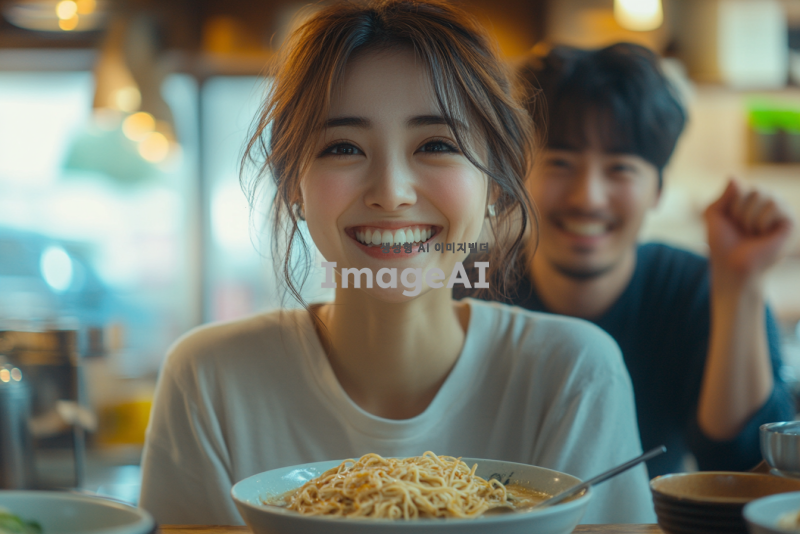 밝은 주방에서 라면을 먹으며 행복하게 웃고 있는 아내, 뒤에서 무릎을 꿇고 손을 들고 있는 남편, 아내는 짧은 머리와 캐주얼한 옷차림, 남편은 약간 당황한 표정, 따뜻하고 유쾌한 분위기, 아늑한 실내 조명, 현대적인 주방 인테리어.