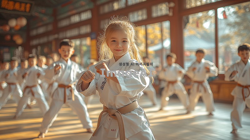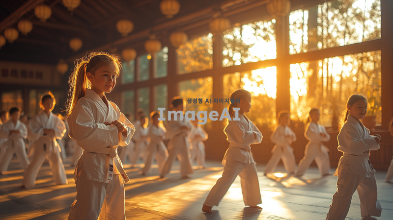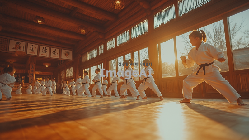 태권도 도장에서 아이들이 태권도 수업을 받는 장면, 밝고 활기찬 분위기, 아이들이 흰 도복을 입고 열심히 연습하는 모습, 벽에는 태권도 관련 포스터와 상장이 걸려있고, 바닥은 푹신한 매트로 덮여있음, 창문으로 햇빛이 들어와 따뜻한 느낌, 도장 내부는 깨끗하고 정돈된 상태, 사범님이 아이들에게 동작을 가르치는 모습, 서로 격려하며 웃고 있는 아이들, 다양한 연령대의 아이들이 함께하는 모습.