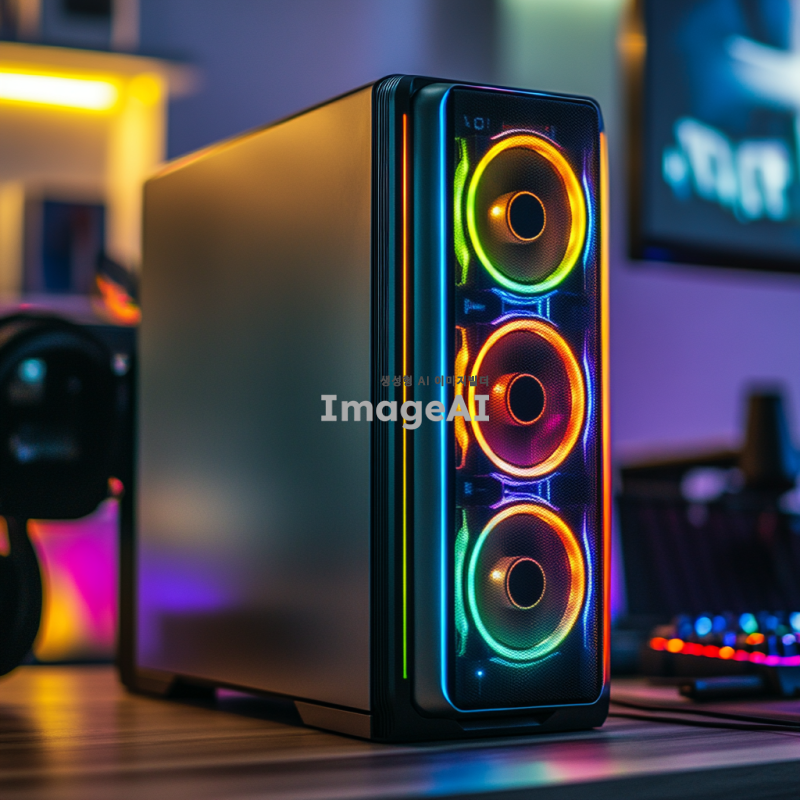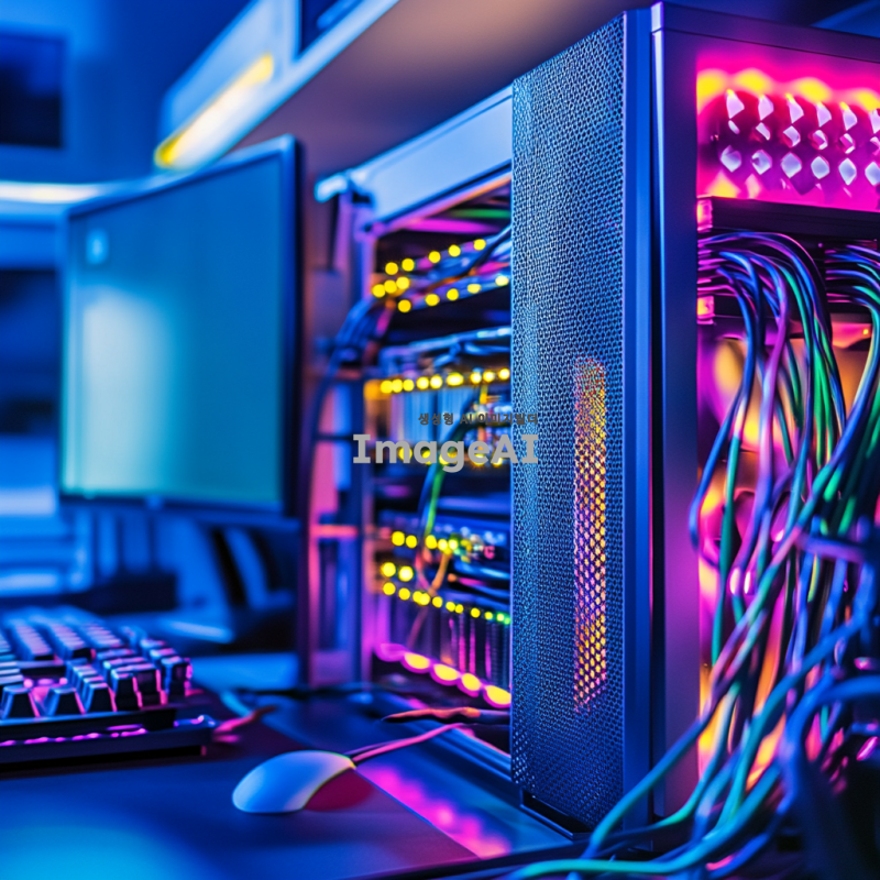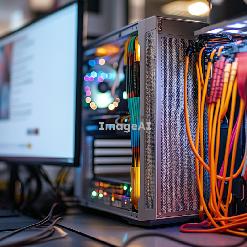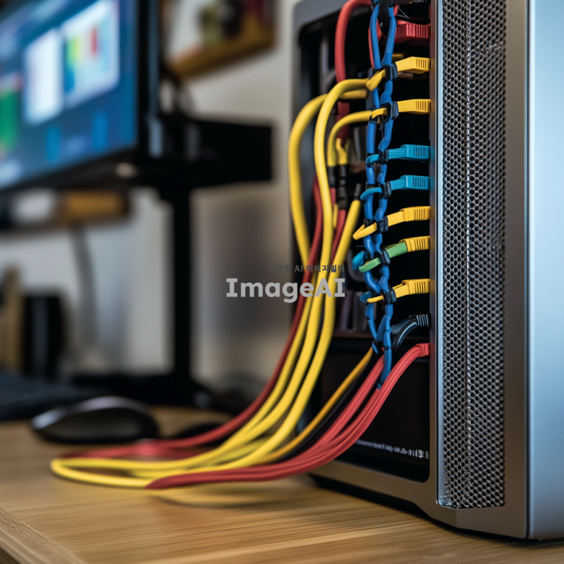 컴퓨터 책상 위에 위치한 현대적인 디자인의 컴퓨터 본체, 다양한 색상의 케이블이 본체의 포트에 정확히 연결되려는 순간, 케이블 끝이 포트에 근접한 모습, 실내 조명 아래에서 반사되는 금속 본체의 질감과 케이블의 디테일이 잘 드러나는 장면, 주변에는 깔끔하게 정리된 컴퓨터 주변기기들이 놓여 있는 설정.