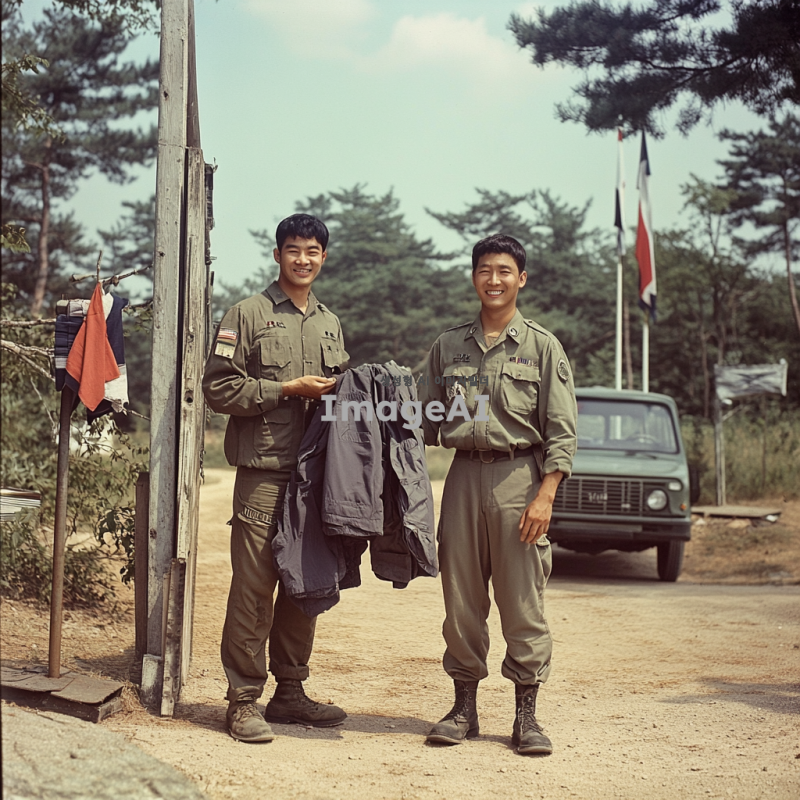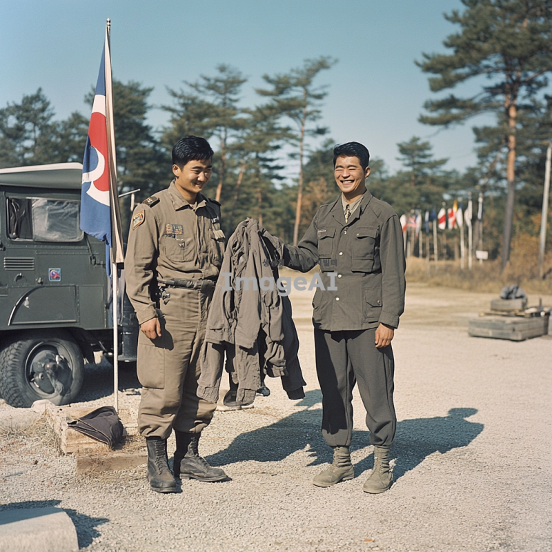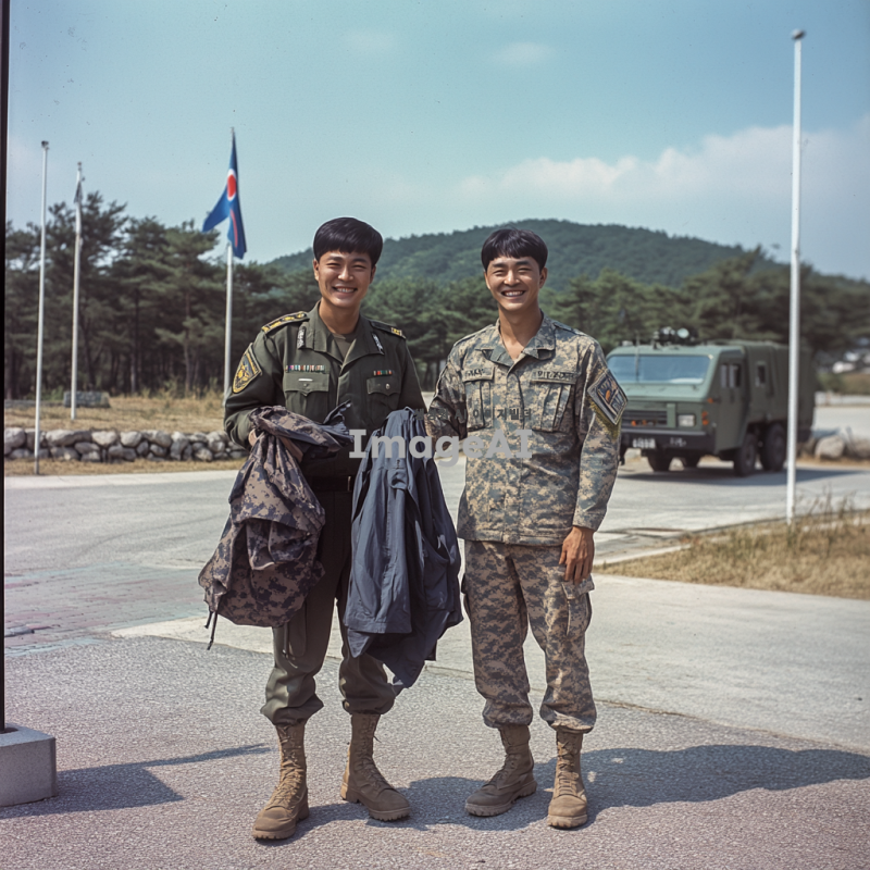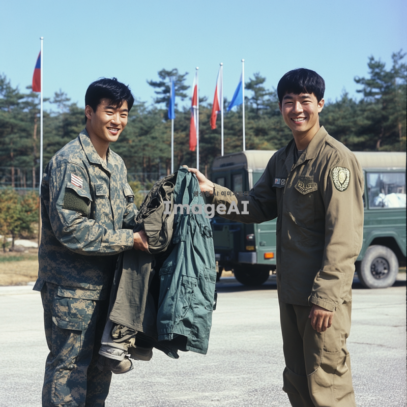 한국 군인이 군복과 군화를 들고 서 있는 모습, 옆에는 세탁관리업체 직원이 미소를 지으며 수거하고 있는 장면. 군인은 깔끔한 군복을 입고 있으며, 세탁관리업체 직원은 단정한 유니폼을 입고 있다. 배경은 군부대의 깔끔한 정문 앞이며, 주변에는 나무와 깃발이 보인다. 세탁관리업체 차량이 뒤쪽에 주차되어 있는 모습.